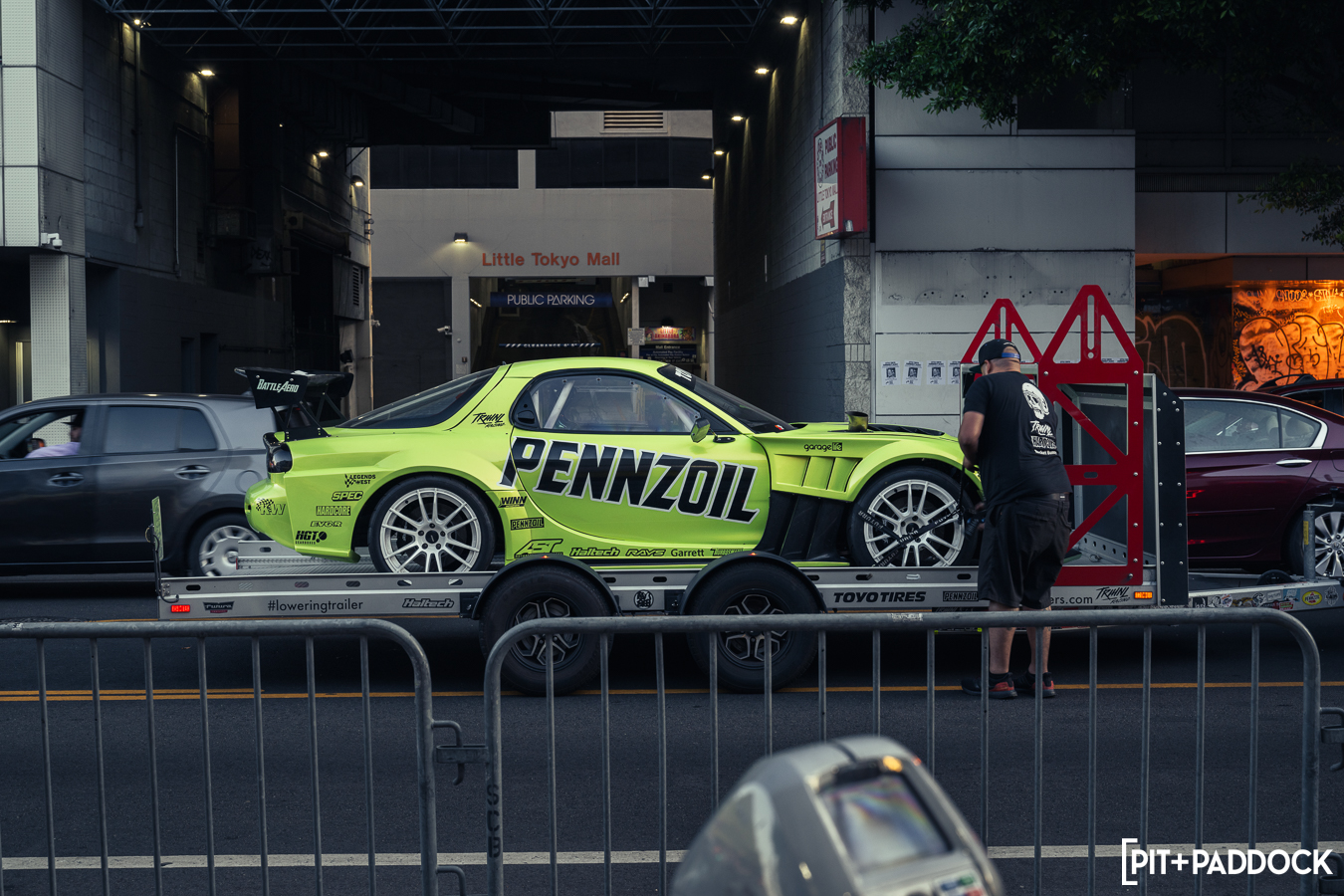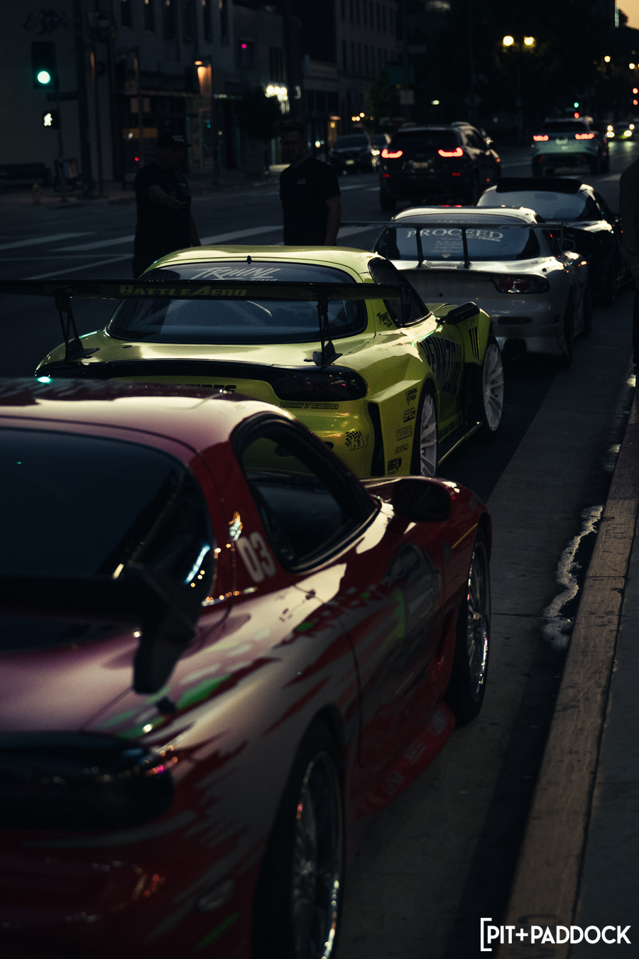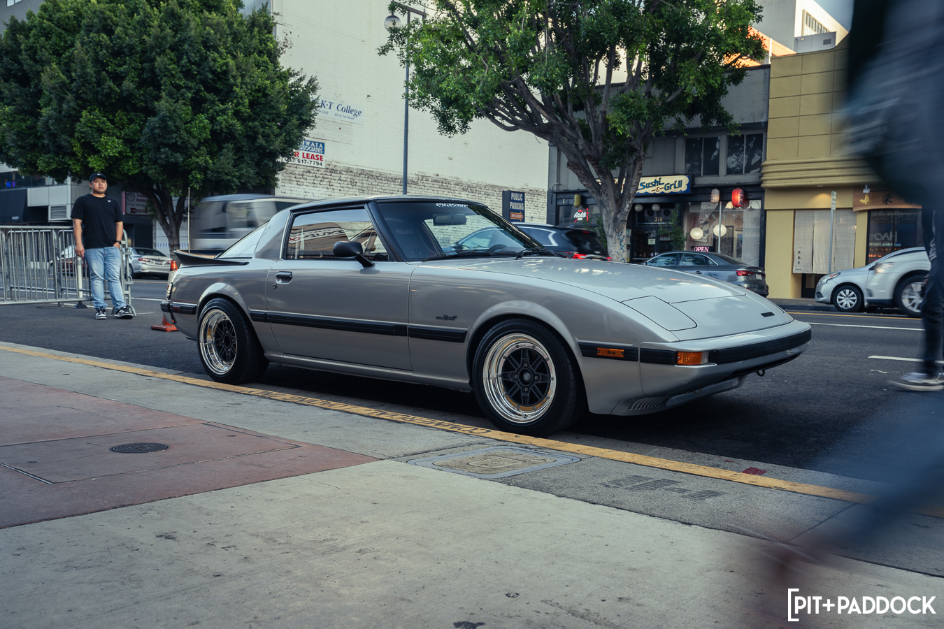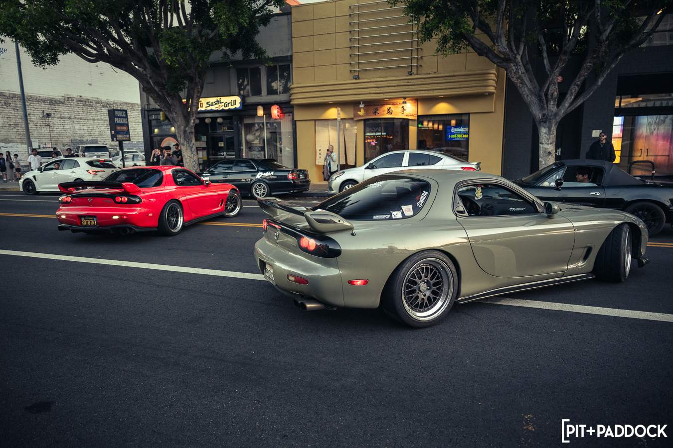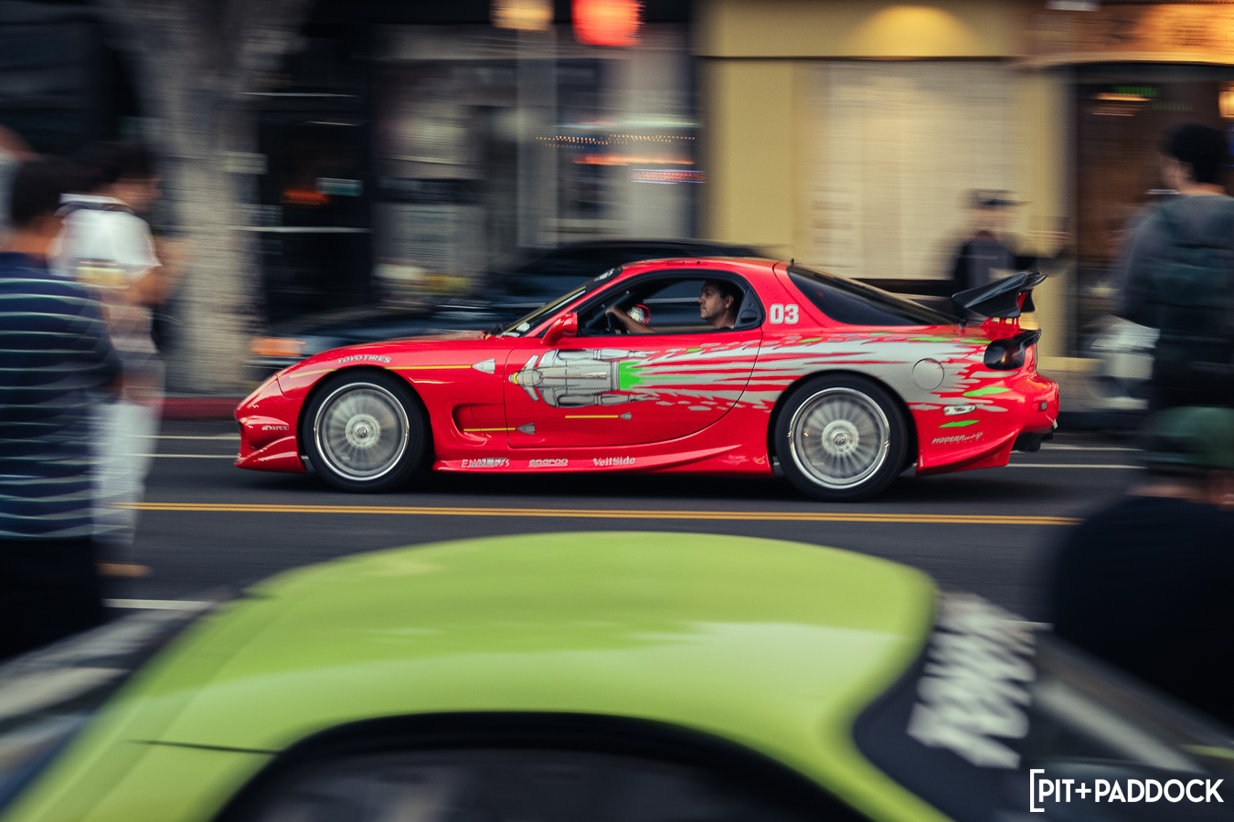 Once Daryl’s RX-7 was positioned into place, the sound of rotary engines echoed through Japantown as RX-7s and RX-8s cruised up and down 1st Avenue. Just outside Bowls, seven FD RX-7s secured primo parking spaces, which included a special appearance from Jonathan Grunwald. You’ll remember Jonny as his white TCP Magic widebody RX-7 was the very first Pit+Paddock poster giveaway two years ago. His other FD project car is this bright green one that summons 1,200hp and makes so much noise that it could easily deafen anyone who’s standing within a 30-foot radius. In addition to Jonny’s race car, Ilia Smolov of Final Bout stopped by with his Team Proceed drift car and a Fast & Furious replica car which couldn’t have looked more at home in downtown LA.