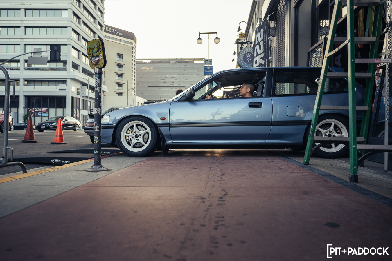 As 7:00 PM rolled around, people started filing into Little Tokyo to watch Bowls’ “changing of the guard” ceremony as Jonathan Wong’s EF Honda Civic was replaced by Daryl’s FB. The process isn’t the easiest; the doors must be removed to maximize the width for each car to enter and exit. Then there’s stopping traffic on a busy Friday evening while finessing both cars up and down the sidewalk via race ramps. It’s a procedure that can take up to an hour, but luckily this is the sixth display vehicle at Bowls, and it’s become more of a streamlined than a stressful affair.