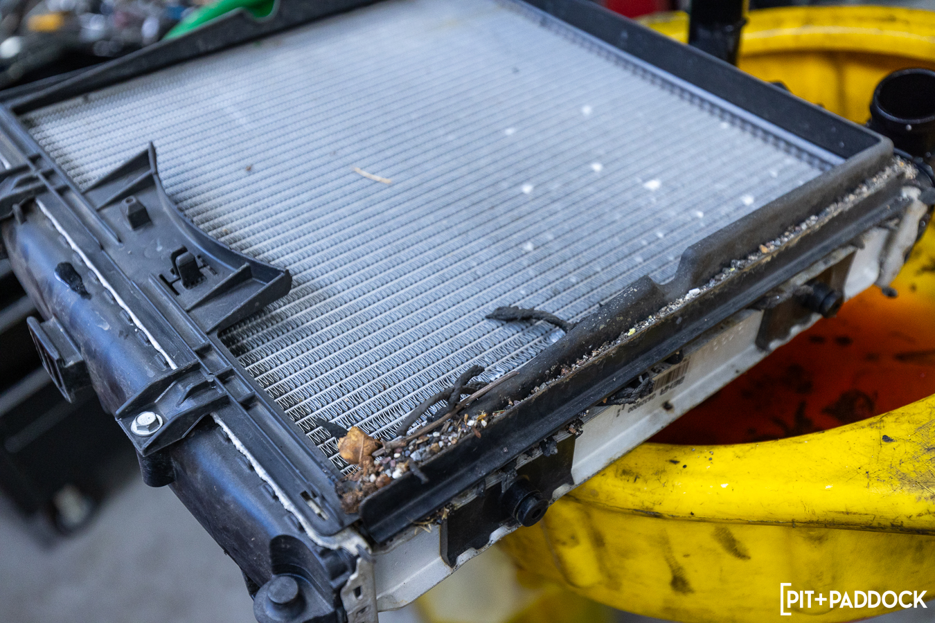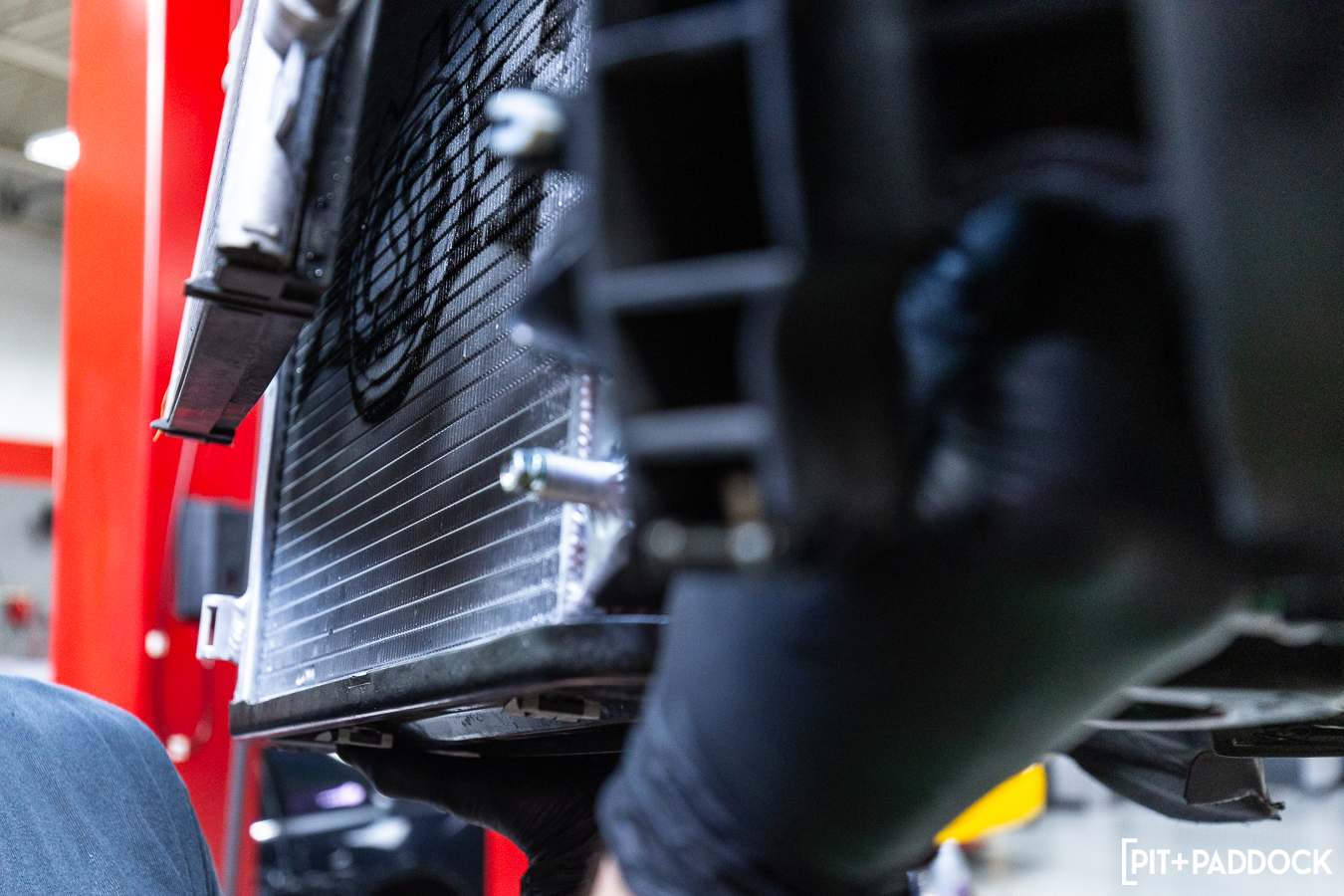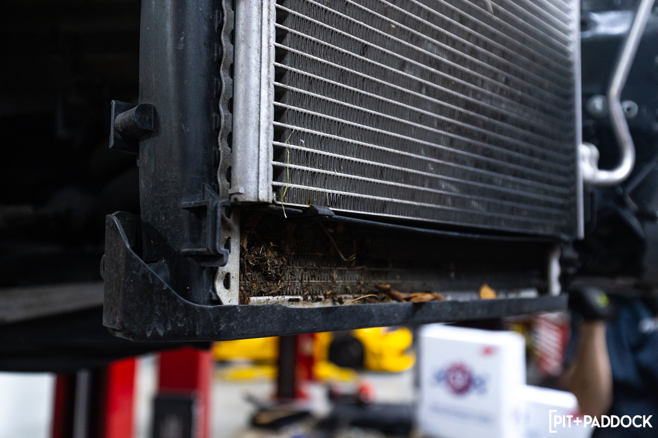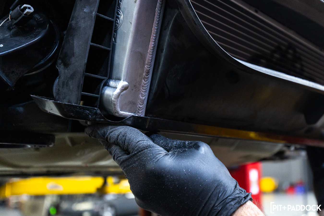 The clearances on the passenger side are tighter, thanks to a fan assembly, an accompanying control unit that mounts to the backside of the shroud, and the horn that sits between the passenger side AC condenser and the center radiator. Basically, it takes a bit more patience to coerce everything out before fitting the CSF replacement.