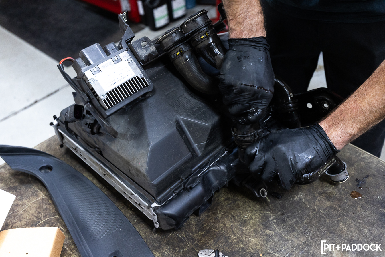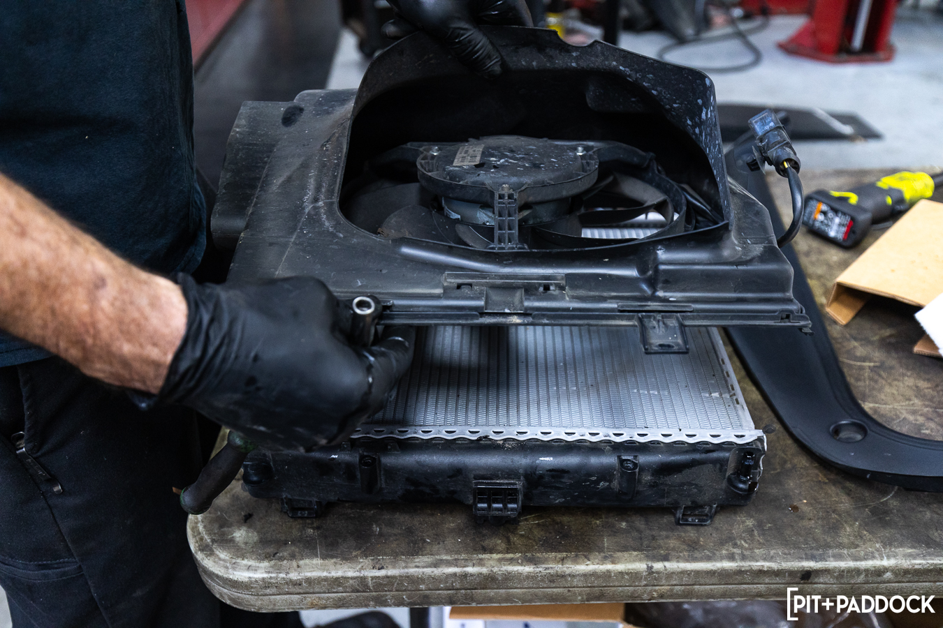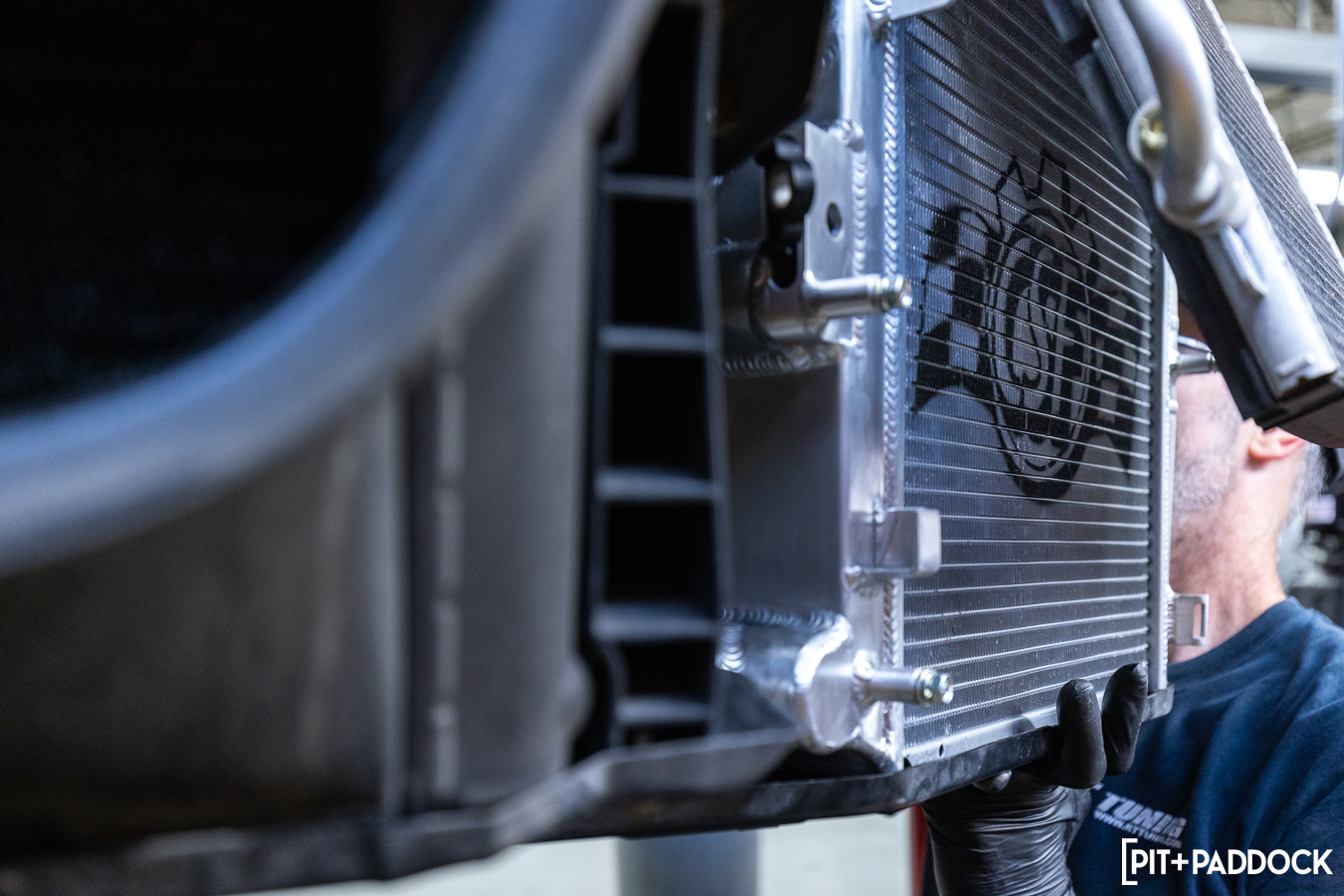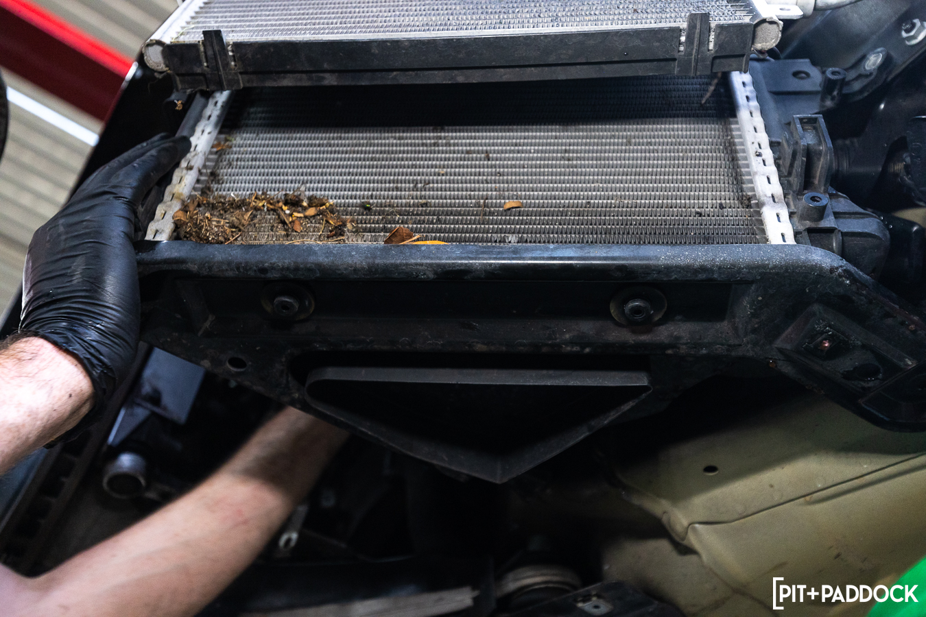 The clearances on the passenger side are tighter, thanks to a fan assembly, an accompanying control unit that mounts to the backside of the shroud, and the horn that sits between the passenger side AC condenser and the center radiator. Basically, it takes a bit more patience to coerce everything out before fitting the CSF replacement.