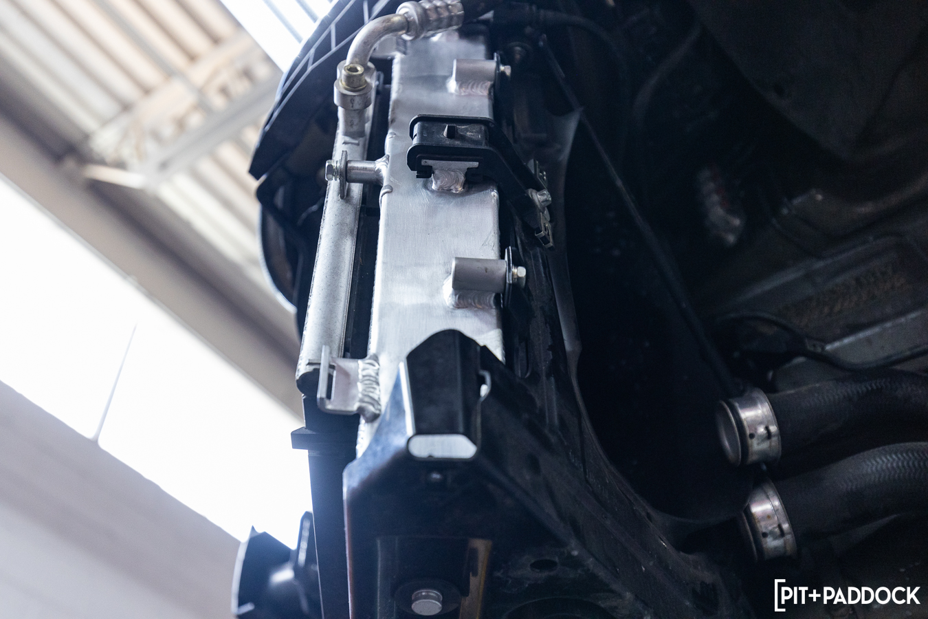 Despite each side radiator being shielded by a pass-through AC condenser, there is still plenty of road and track debris that can clog your factory heat exchangers over time. Since the bumper is off already, it’s a good time to clean up the condensers and replace any worn coolant hoses. Every factory piece, including the plastic mounting brackets and metal base, transfers seamlessly onto the CSF unit, and installing it back into place is literally the reverse of removal.