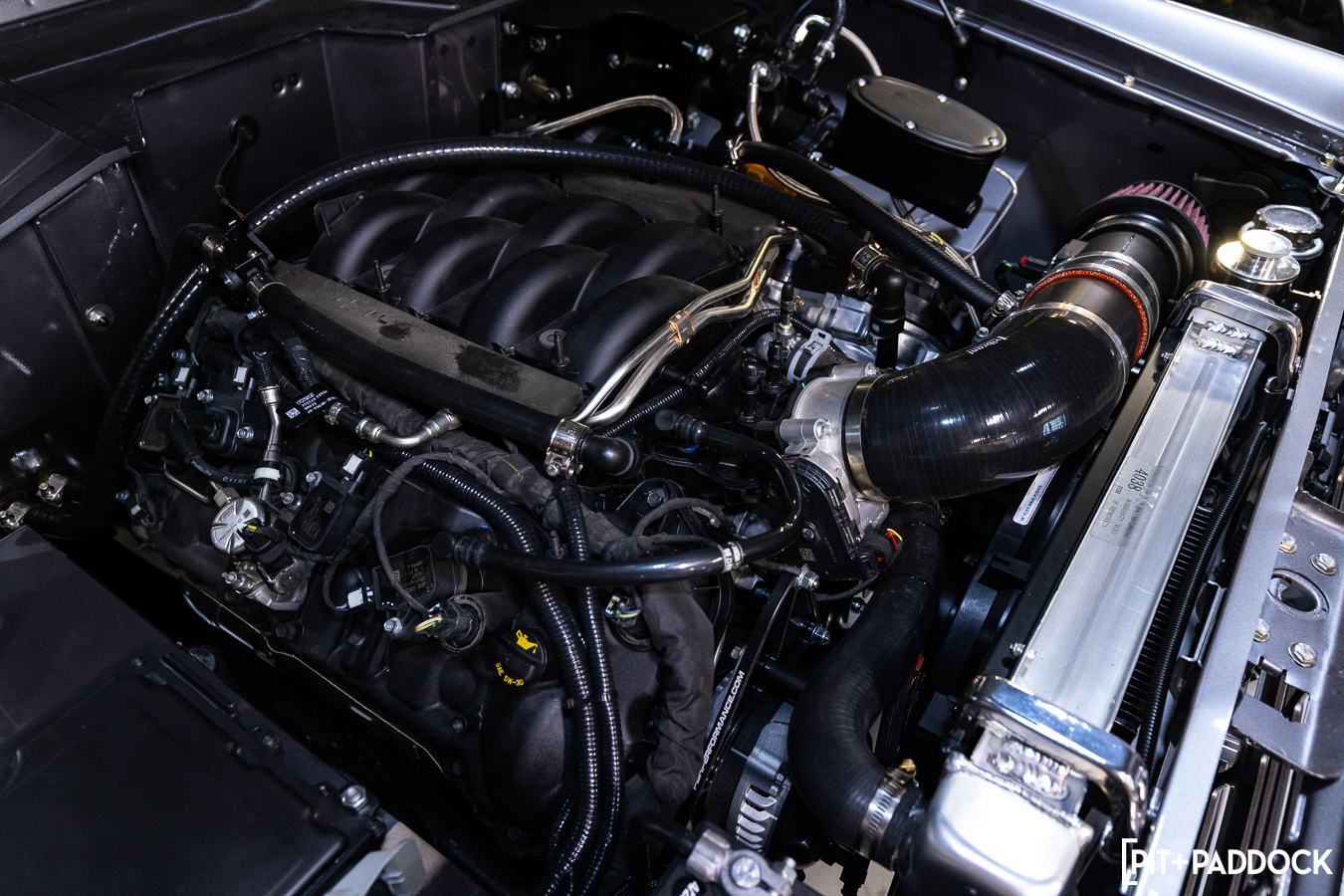 This particular Bronco came to R/T Tuning with one very specific request: it had to be powered by a 5.0-liter Coyote engine. Fortunately, this motor is readily available directly from Ford. “Because this swap is fairly popular there were already off-the-shelf engine mounts, an off-the-shelf transfer case adapter, and off-the-shelf headers to fit the chassis,” Erik Wilson of R/T Tuning confesses. “We had to do a little fab work on the chassis to clear some accessories, but for the most part it dropped right in.”