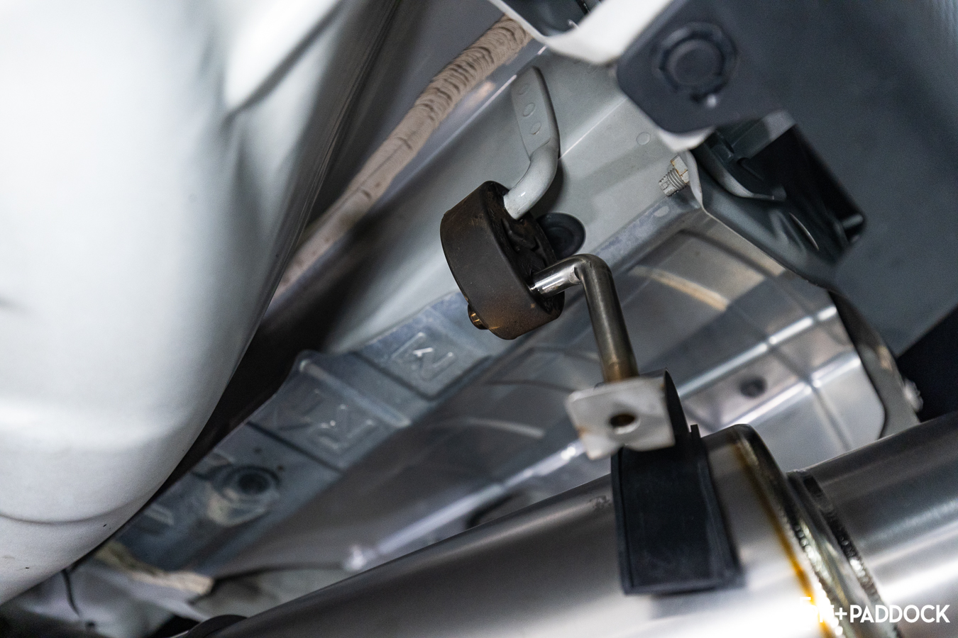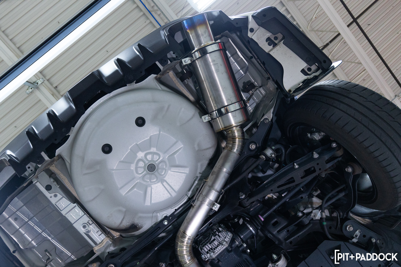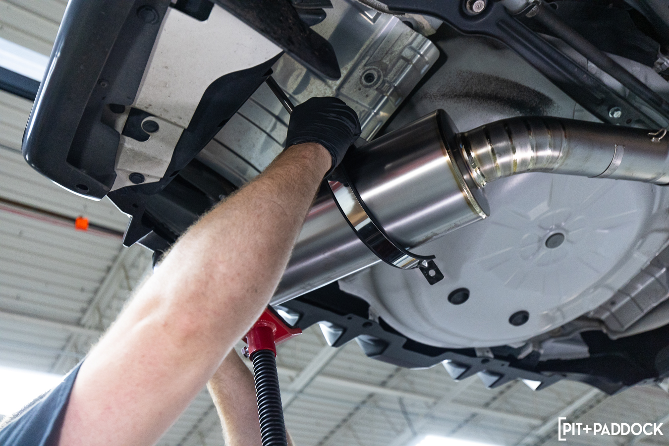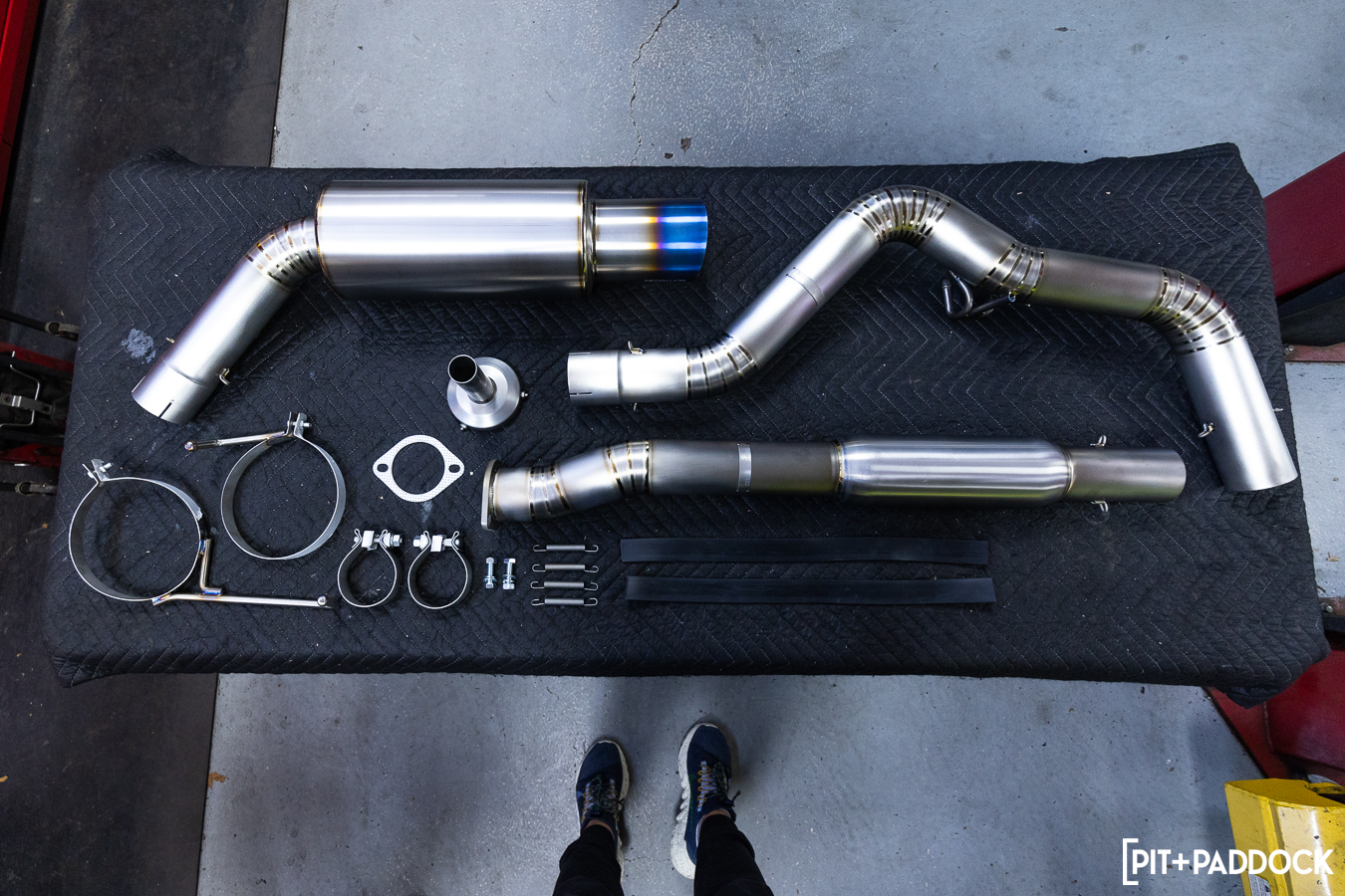 The muffler attaches to the OE exhaust hangers via two included t-bolt clamps. We found that mounting the rearmost clamp as close to the end of the muffler works best to maintain enough clearance to the diffuser. Tension springs are included as an added measure to the sturdy connecting clamps. The former ensures that nothing comes loosened during those spirited drives.