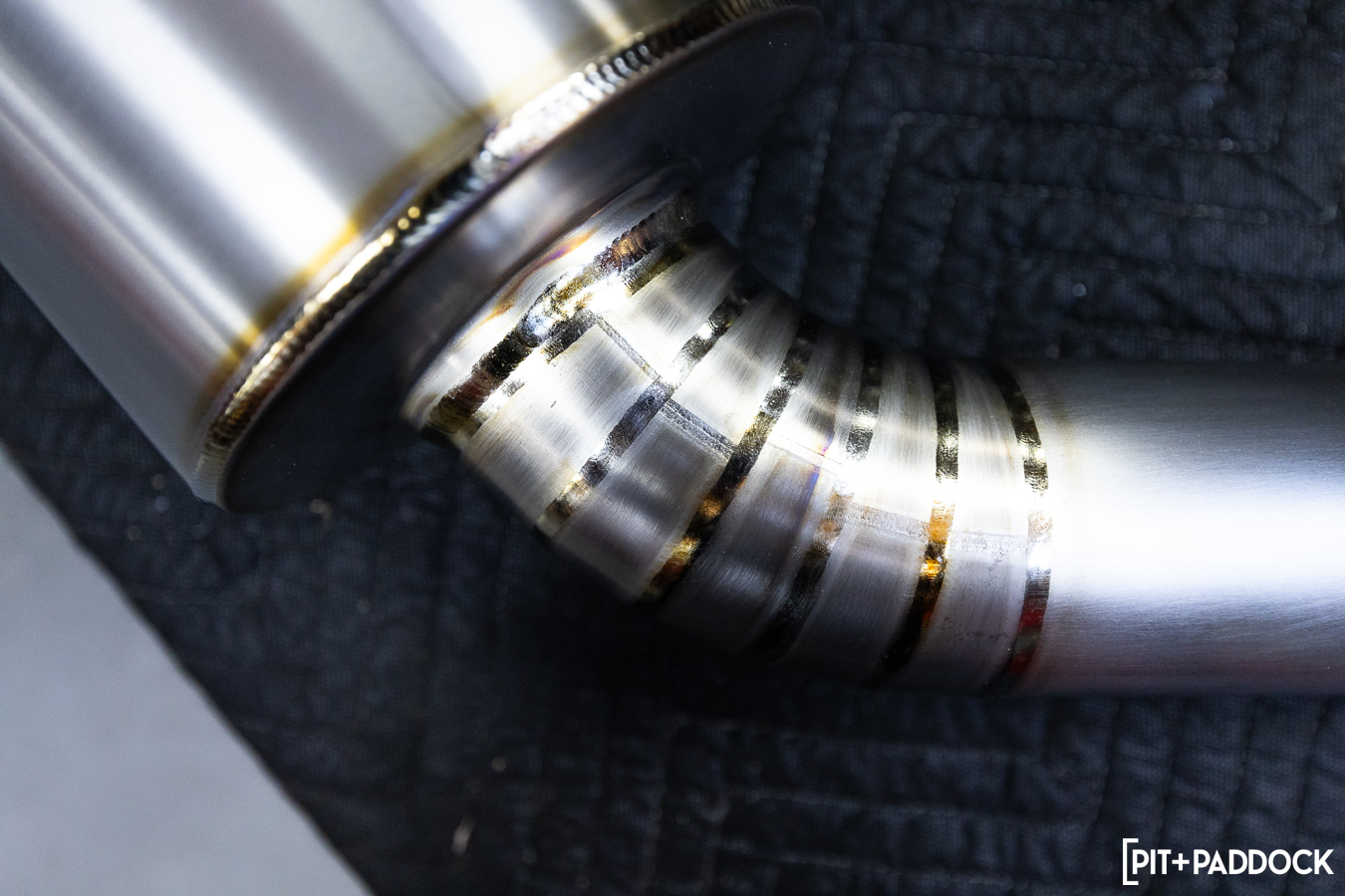 For one thing, you won’t be throwing your back out lifting this box out of your car; its full-titanium construction means that this system is light, even compared to the muffler delete that was on this car before. The Revel unit preserves the factory system’s 3.0” pipe diameter, but in pursuit of even more weight savings, it swaps the quad exhaust for a single-exit setup. The new exhaust routing provides ample opportunity to admire Revel’s TIG-welded construction and high-quality pie-cut bends.