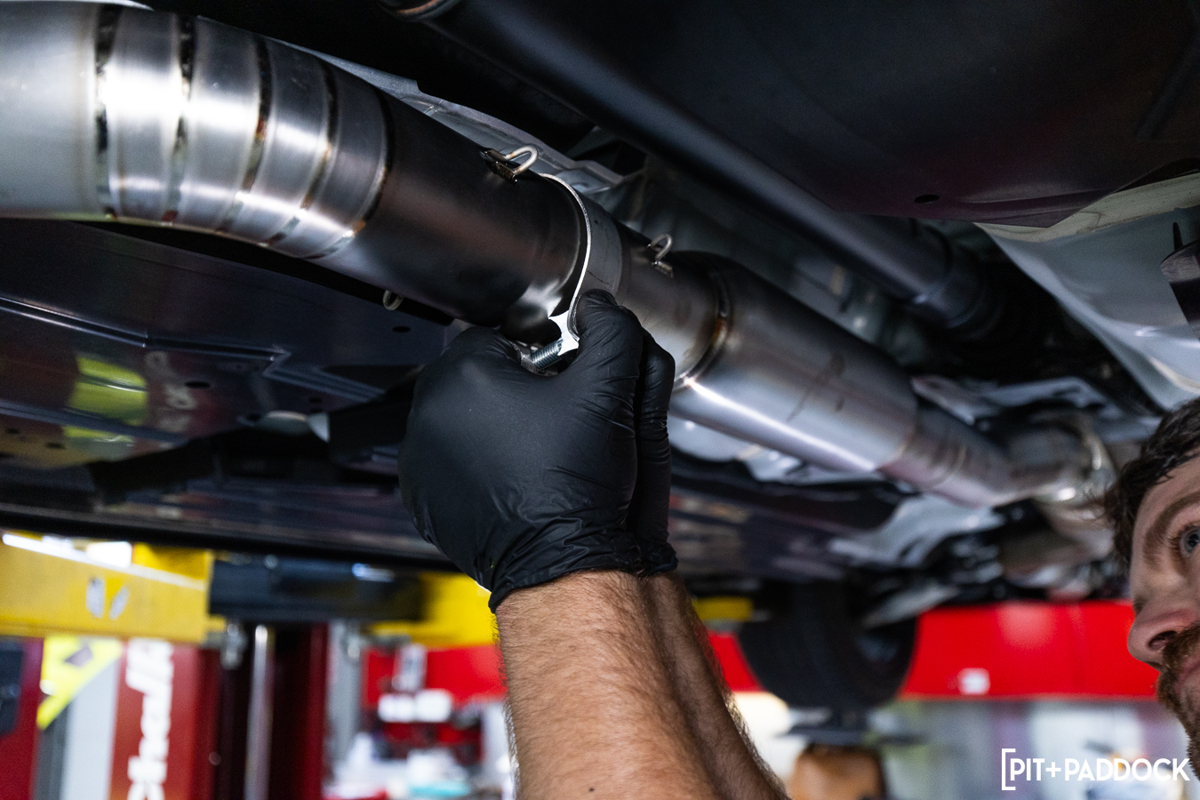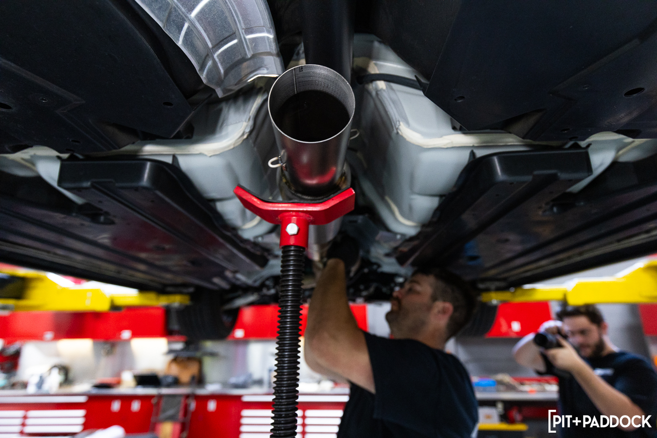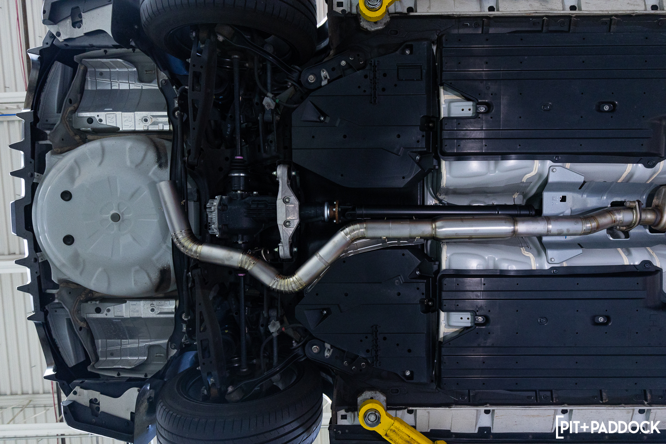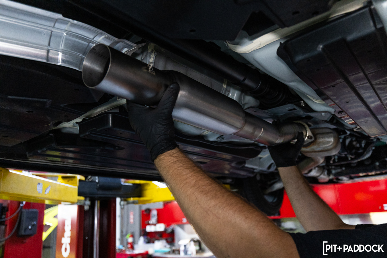 Thereafter, the center pipe bolts onto the front pipe. Here, you’re able to see how the Revel center pipe perfectly routes around the factory components with adequate clearance throughout.
