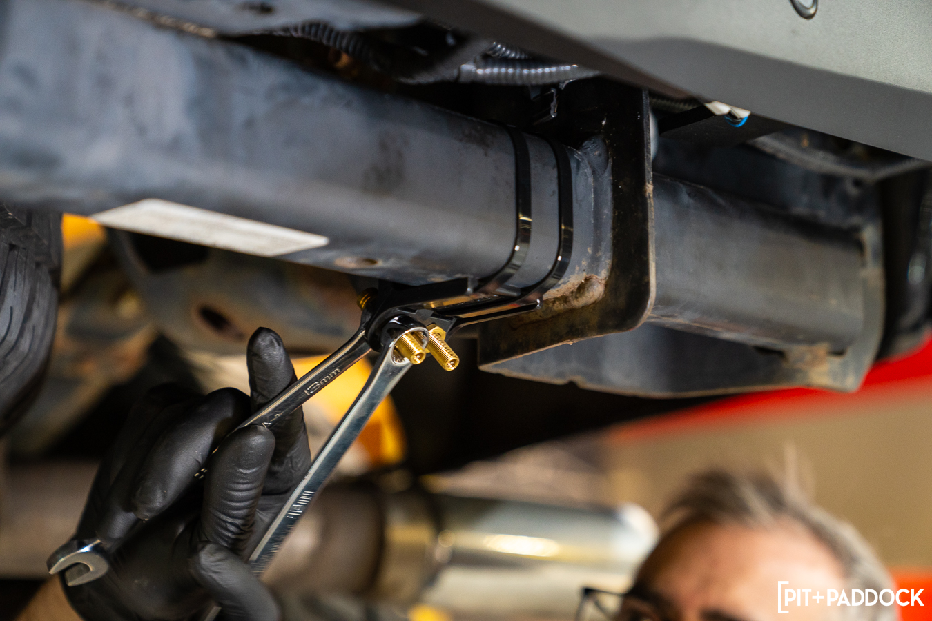 The first step is getting the truck onto a lift to remove the factory helper springs. With the help of the included Ride-Rite brackets, Firestone air springs fit directly into the OEM locations — between the F-150’s suspension and frame — so that they are able to provide correction where the truck needs it most.