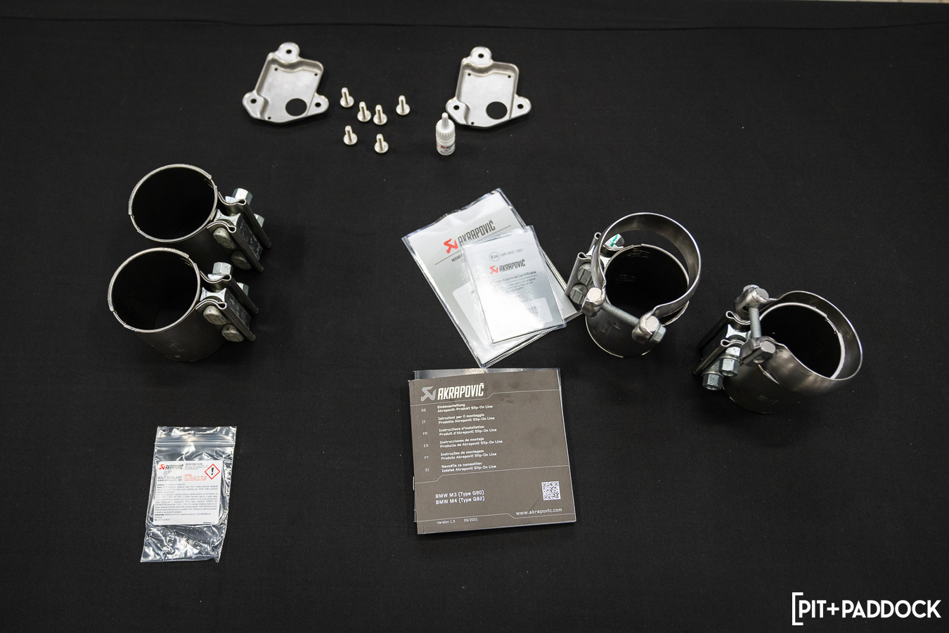 Titanium Exhaust: The engineering and quality that we’ve come to expect from Akrapovič is only matched by its ease of installation; Akrapovič includes everything you’d need from start to finish, including bolt sealant. The OEM exhaust hanger bushings and valve actuators transfer directly onto the Akrapovič’s provisions and the whole system installs just like a factory unit. The tubing that routes from the main canister protrudes further outward, making it easy to see which tips are meant for each side.