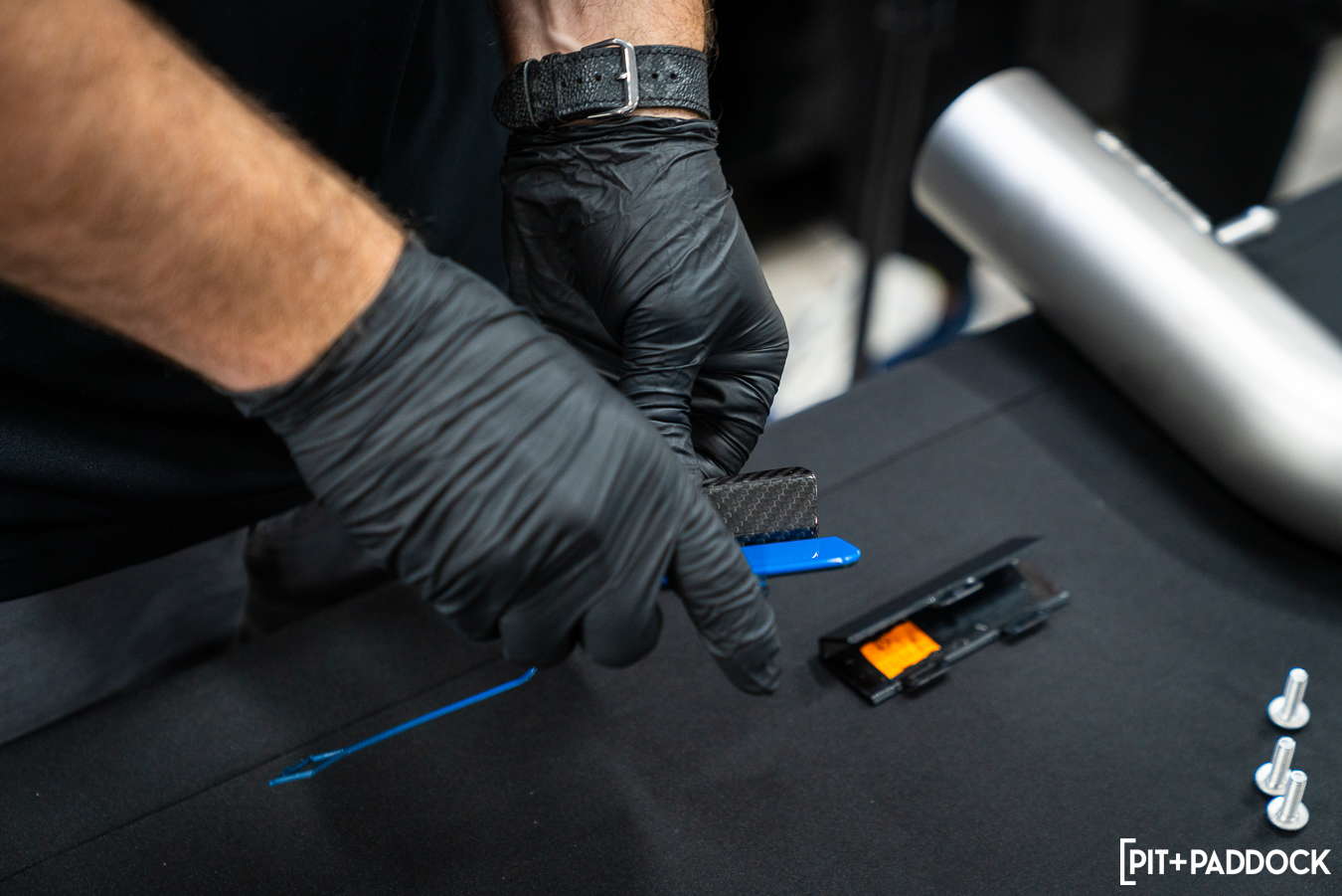 Rear Diffuser: While the exhaust was out, we took the opportunity to put on the Akrapovič carbon fiber diffuser. This piece repurposes all of the factory mounting holes, so once you’ve lined it up onto the bumper panel, it’s just a matter of pushing the diffuser in to seat all the tabs. The same treatment applies to the tow hook cover that we mentioned earlier.