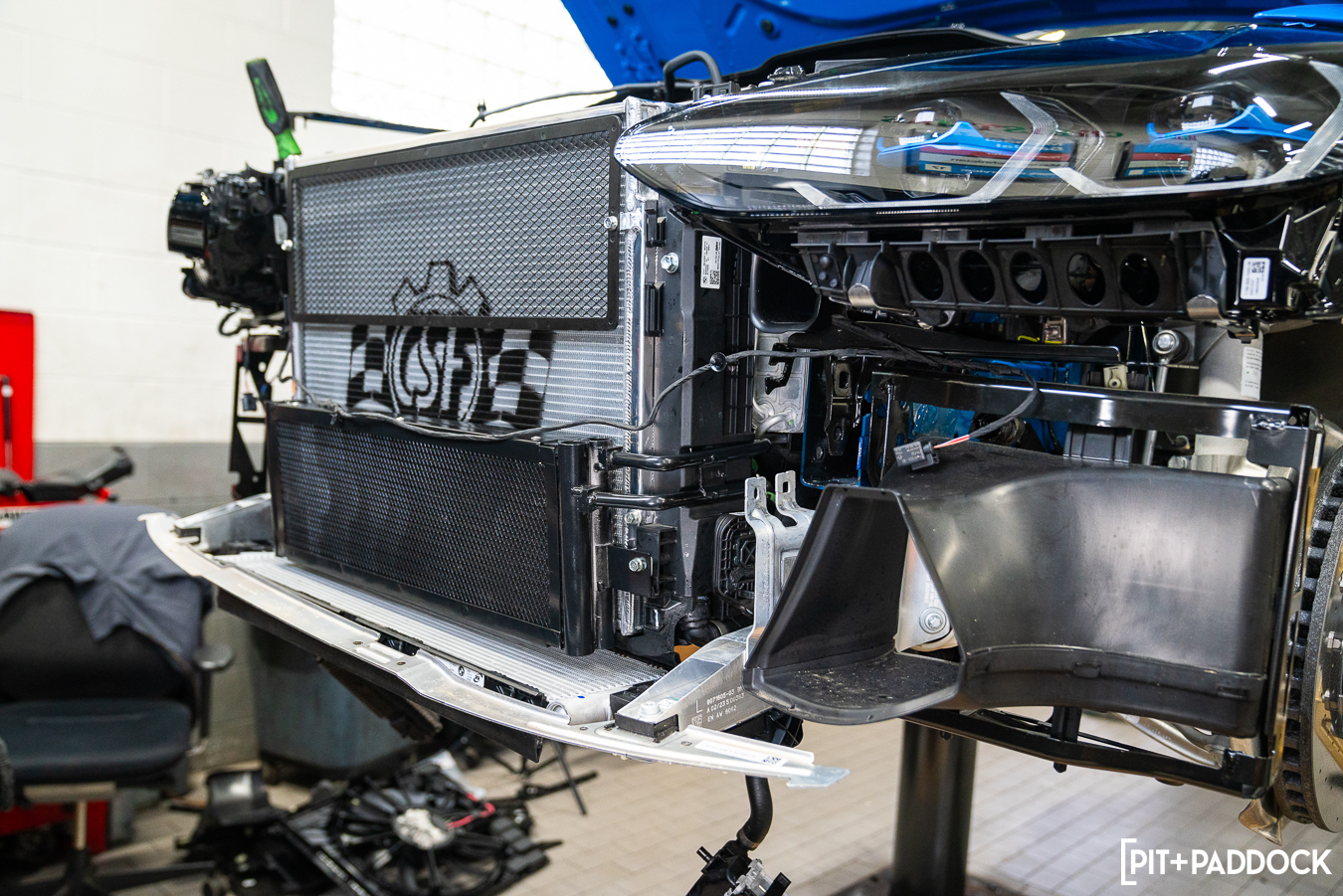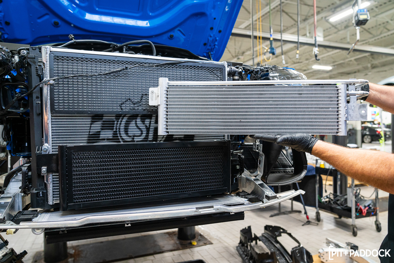 The CSF transmission cooler (8221), the second piece of the company’s trio, actually mounts securely to its heat exchanger. While the ZF 8-speed transmission is robust, its oil needs to stay within an ideal window to ensure proper shifting and overall operation is sustainable. CSF worked closely with development partners and race teams who provided invaluable insight, experience, and testing feedback to design the best cooler possible. The result is this dual-core, dual-pass cooler that boasts a 194% volumetric core increase and a 94% increase in fluid capacity, while maintaining a full plug-and-play installation.