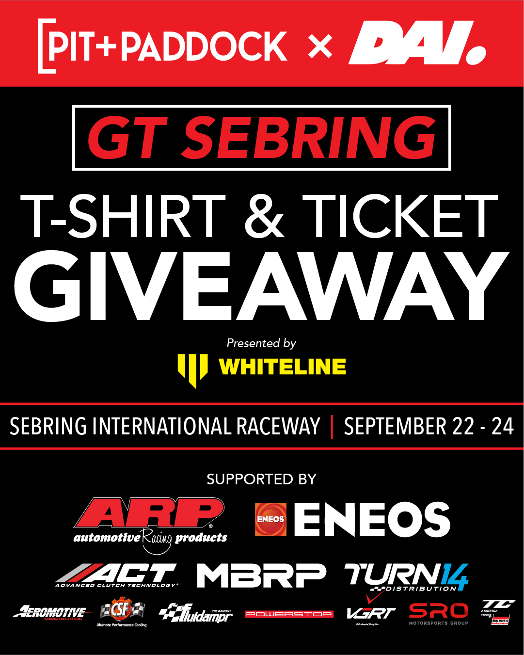 - Thanks to Whiteline Performance, you have a chance to win either a pair of spectator tickets to the race weekend at Sebring or a Dai team t-shirt.