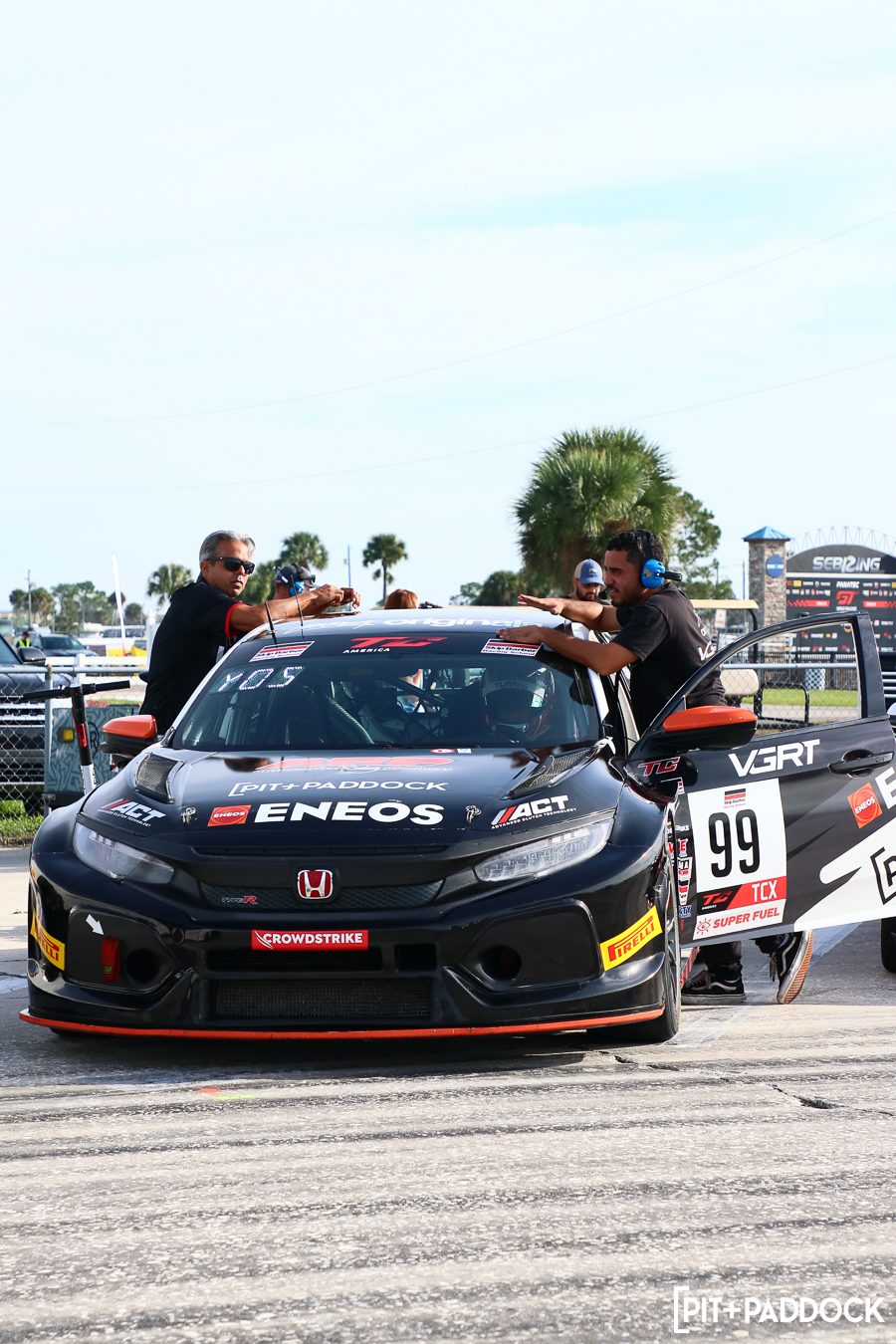 Like most of the circuits on the TC America calendar, this weekend marked the first time Dai had driven at Sebring. Nevertheless, we were once again treated to Yoshihara’s incredible raw pace, earning 3rd place in the first session (0.057 seconds behind his second-place foe). The raceway’s reputation for being harsh on equipment proved true, claiming a rear suspension shock mount on the car during that first go. The VGRT team put all hands on deck to sort out the issue and it paid off. The Pit+Paddock Civic Type R TCX, under the capable control of Dai, went out early during the second practice and earned top honors.