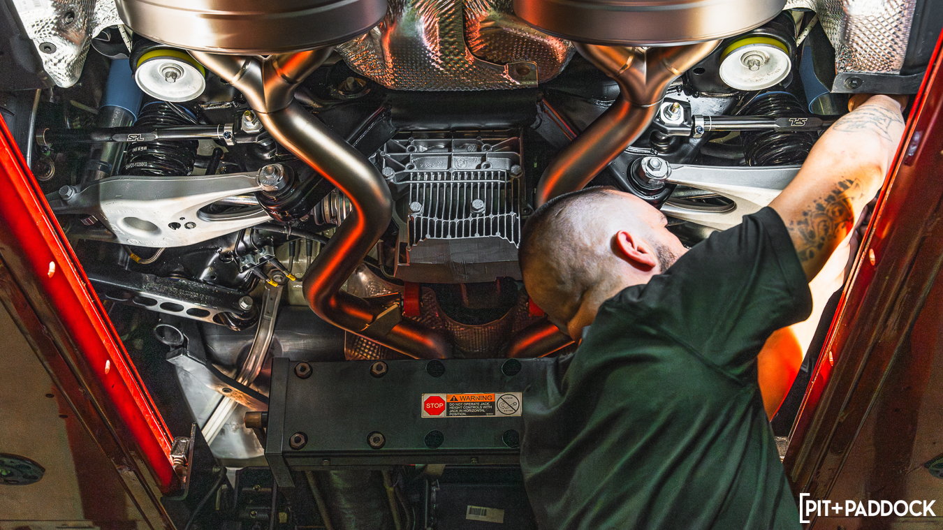 Once the wheels were installed and the car was on the ground, it gave us our first chance to assess how we were going to set the car up for its debut. We moved the car onto the alignment rack and got to work to ensure the Pit+Paddock x Bilstein E91 GTS Tribute would sit perfectly on the SEMA show floor. Our Bilstein and SPL suspension upgrades paid dividends here — making all the necessary adjustments was incredibly easy as a result — and the new wheels and tires looked right at home underneath the E91 GTS’s M3-cladded body. After a quick shakedown to ensure the car’s road mannerisms performed as expected, we re-torqued the wheels and finally stood back to take in all of our hard work.