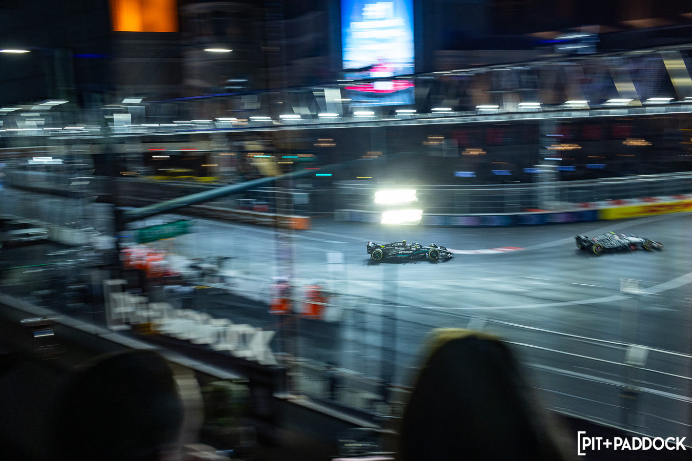 Lando Norris’s McLaren crashed spectacularly in front of our viewing suite, evoking a chorus of “ooohs” and exasperated breaths as his race car spun into the barriers. The corner proved to be a battleground numerous times throughout the contest; several cars accrued bumps and bruises fighting for positions at this turn, the most explosive of which saw World Champion Max Verstappen tussling with George Russell, leaving carbon fiber entrails in their wake from the bout.