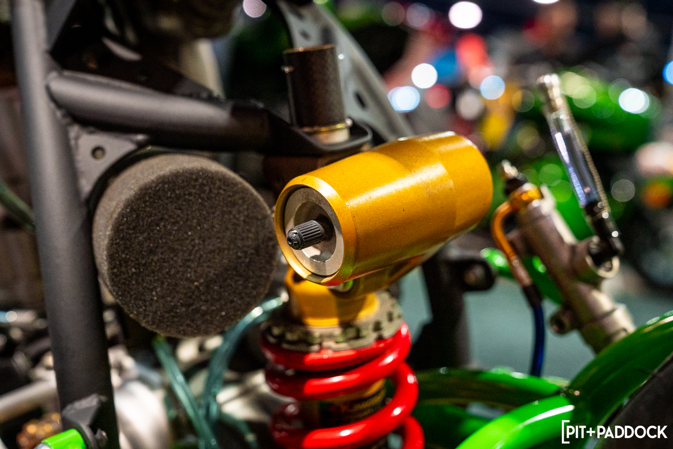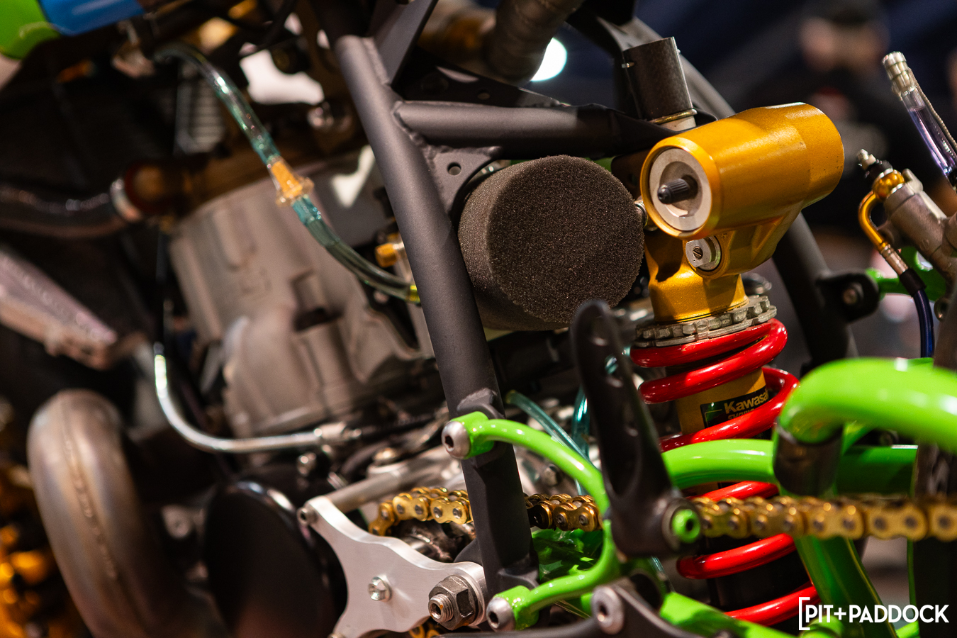 Instant power out of the KX500’s two-stroke single-cylinder engine mixed with the frame’s short wheelbase made for a wild ride. Mirroring the geometry from the newer Kawasaki Ninja (even fabricating the swing arm to fit his specifications), Elkins’ dialed in this custom machine to fit his vision. This isn’t a bike you go on a leisurely cruise with, it’s the type to get your blood pumping as you rip down the road and let the RPMs sing as you switch through the gears. With the help of the FMF Gold Series Fatty exhaust, this little rocket puts a smile on anyone’s face. This KX500 not only has the looks but has the chops to back it up having shown at shows like Motoblot and AIMExpo.