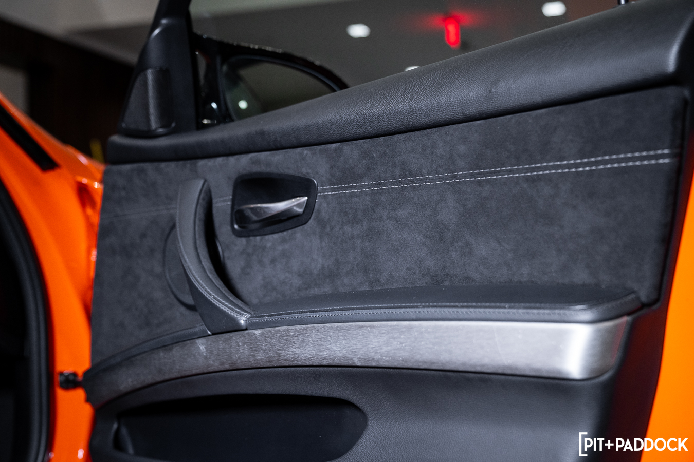 The backdrop for the E91 may not look like Europe, and you’d be right. We’ve saved a photoset from its time at Turn 14 Distribution HQ to showcase some of the wagon’s finer details. The exterior is undeniably eye-grabbing—the combination of Fire Orange paint, Bilstein Clubsport coilover suspension, BBS E88 wheels, and aero add-ons see to that—but open one of the doors, and you’ll realize that the interior is just as fetching. An über rare set of BMW Performance seats were sourced from Blue Chip Automotive and set the stage for a coordinated makeover throughout. The rear seats were reskinned and patterned to match the front pair, while the grey Alcantara and white contrast stitching were carried over onto the door sills, center console, headliner, and trunk area.