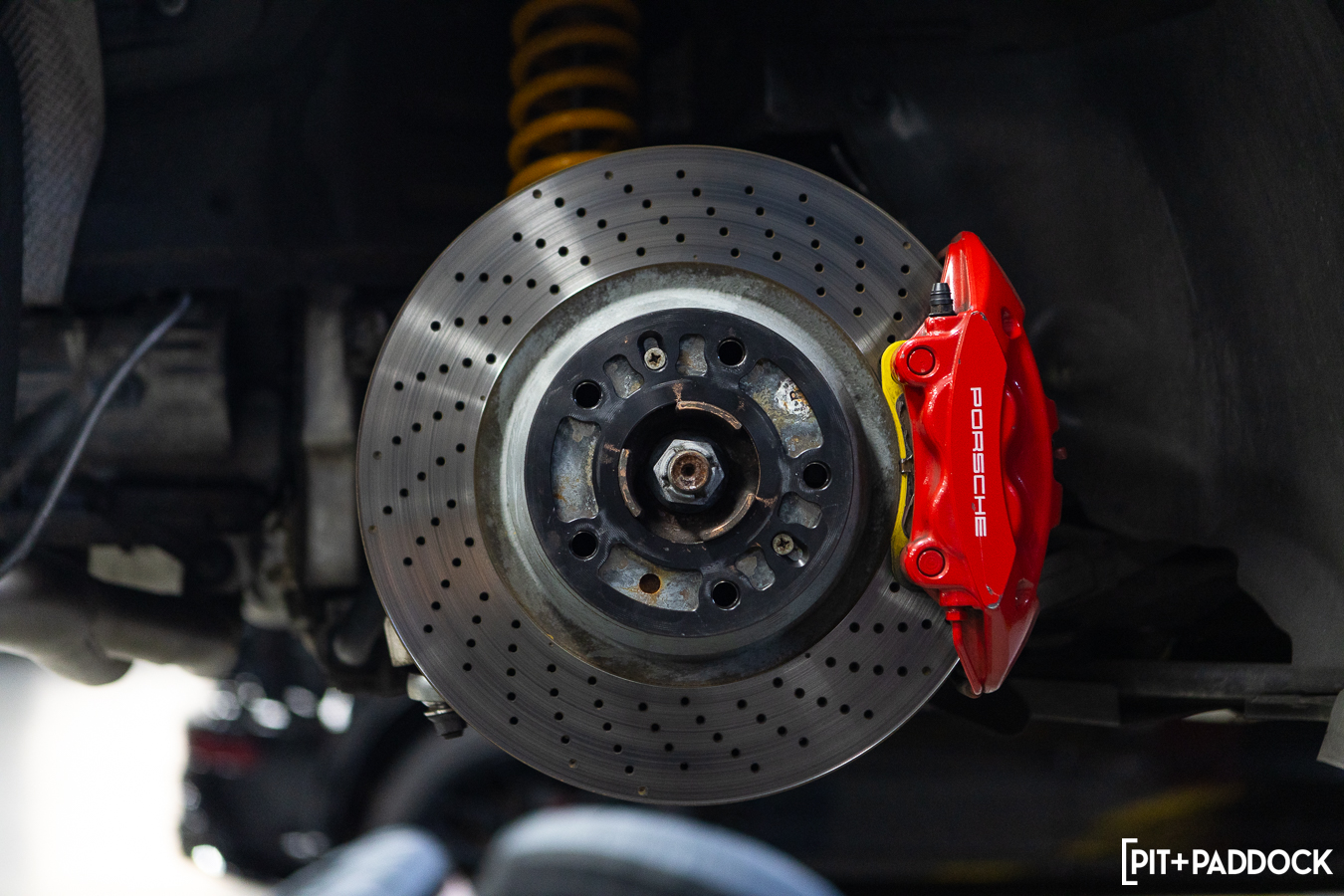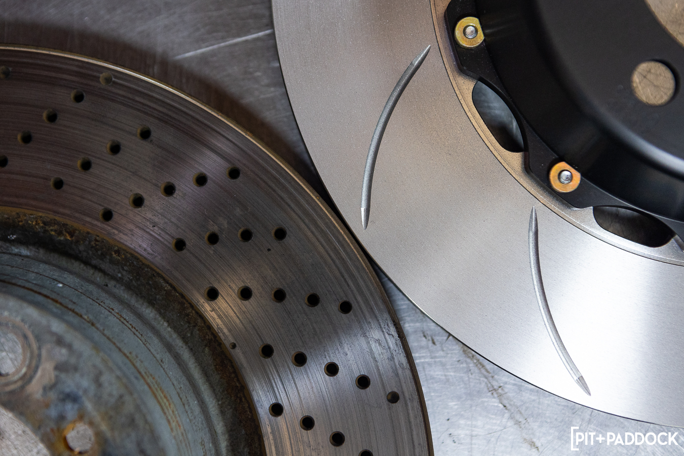 The factory 997 GT3 rotors are cross-drilled, which on street cars, have tangible benefits to manage heat transfer. But their strengths can turn into weaknesses in more demanding driving conditions—they can develop small cracks over time, which shorten their lifespan dramatically. Slotted rotors are the superior choice in these competitive environments; they offer better pad bite and also evacuate gas and dust with more proficiency than their cross-drilled counterparts. This means more uniform contact can be achieved between the pad and rotor surface. Ultimately, better contact means more friction, which equals better stopping power.