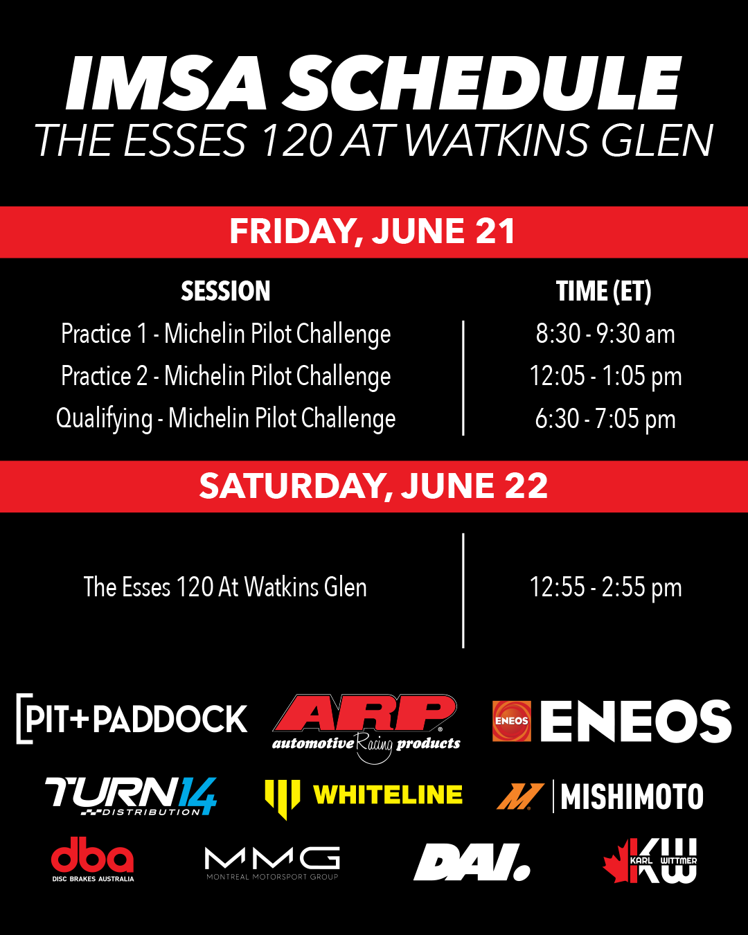 Thank you to ARP, ENEOS, Turn 14 Distribution, Mishimoto, Whiteline, and DBA for supporting Pit+Paddock’s inaugural IMSA Michelin Pilot Challenge campaign with Montreal Motorsport Group.