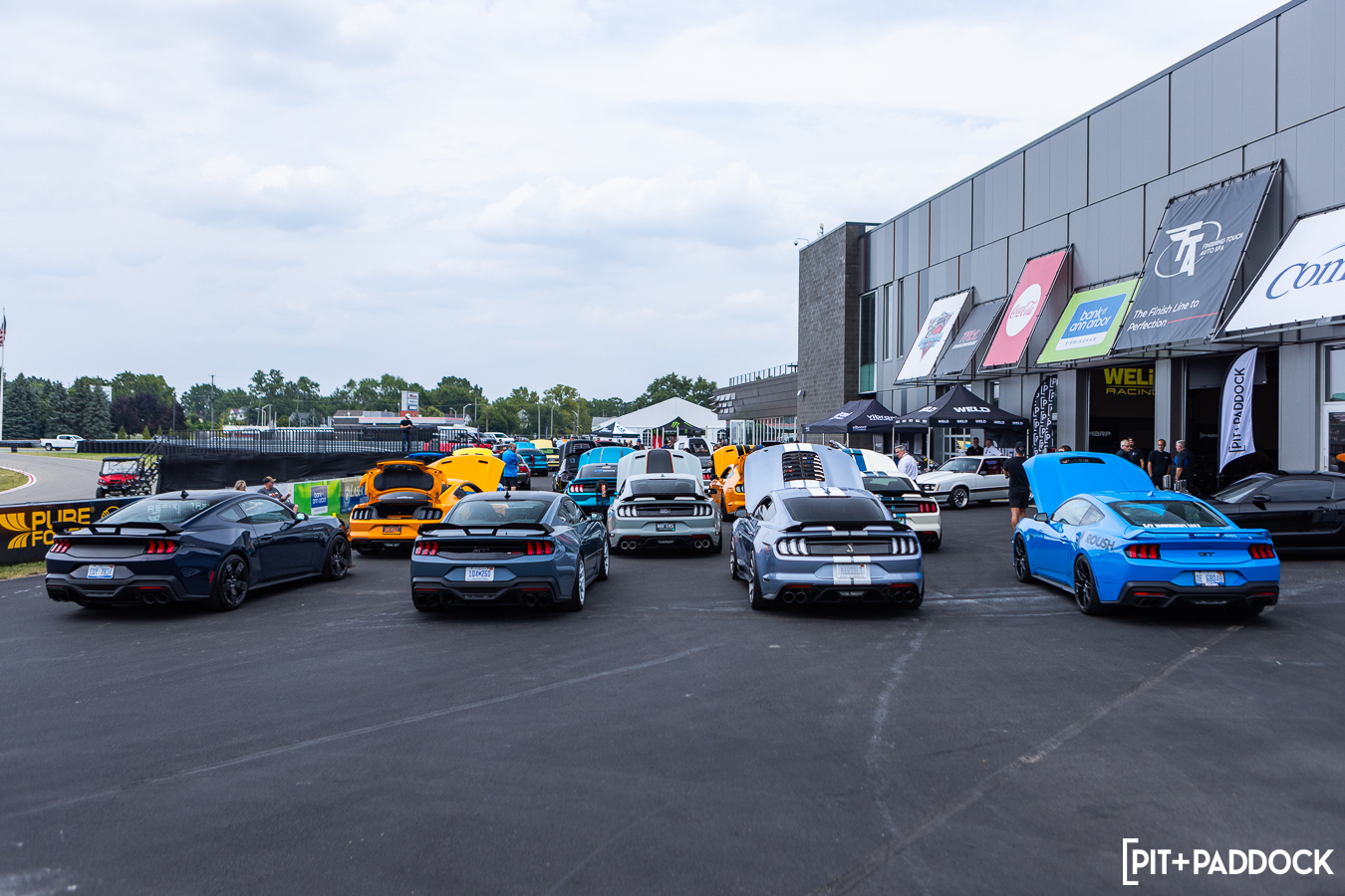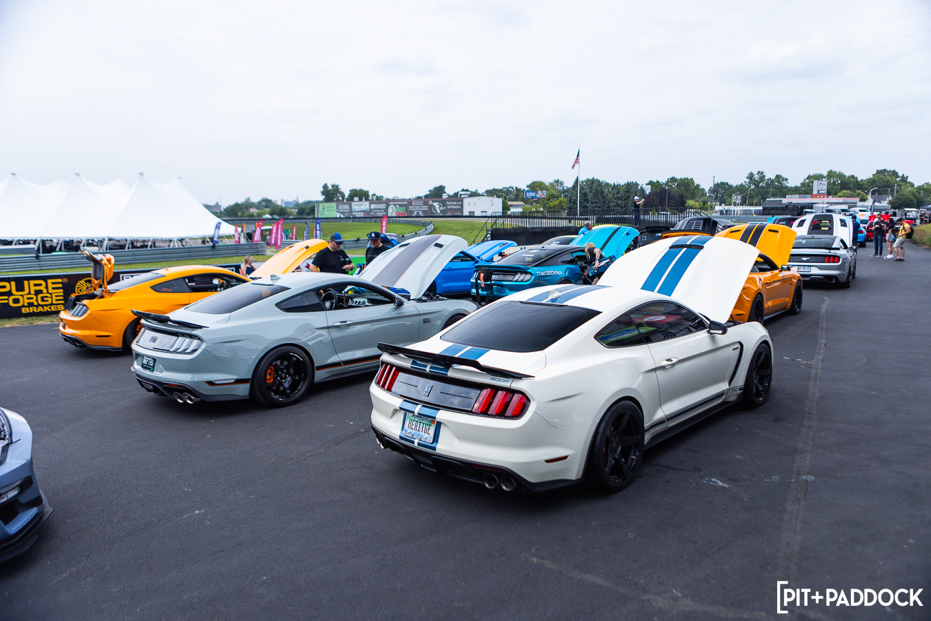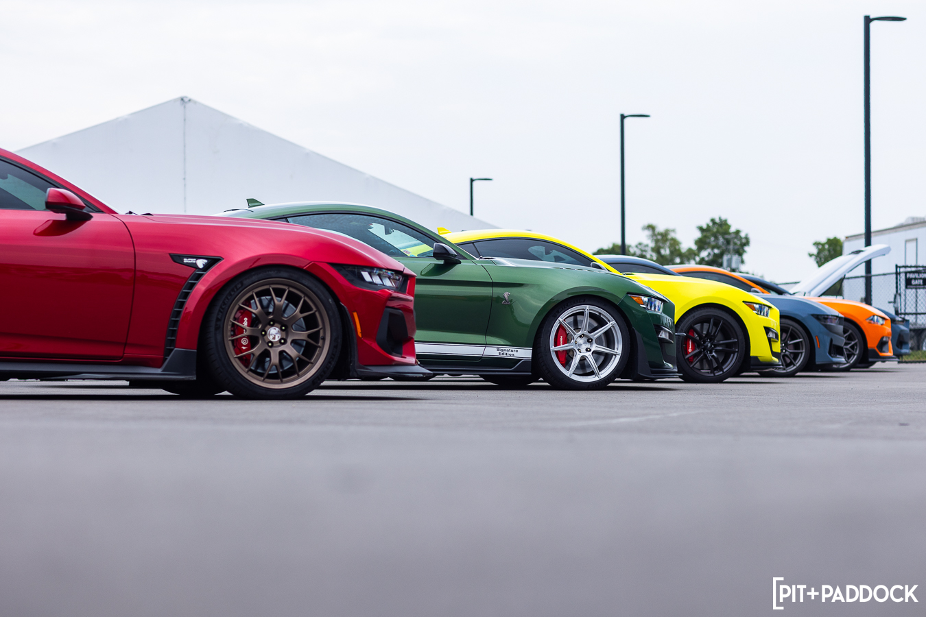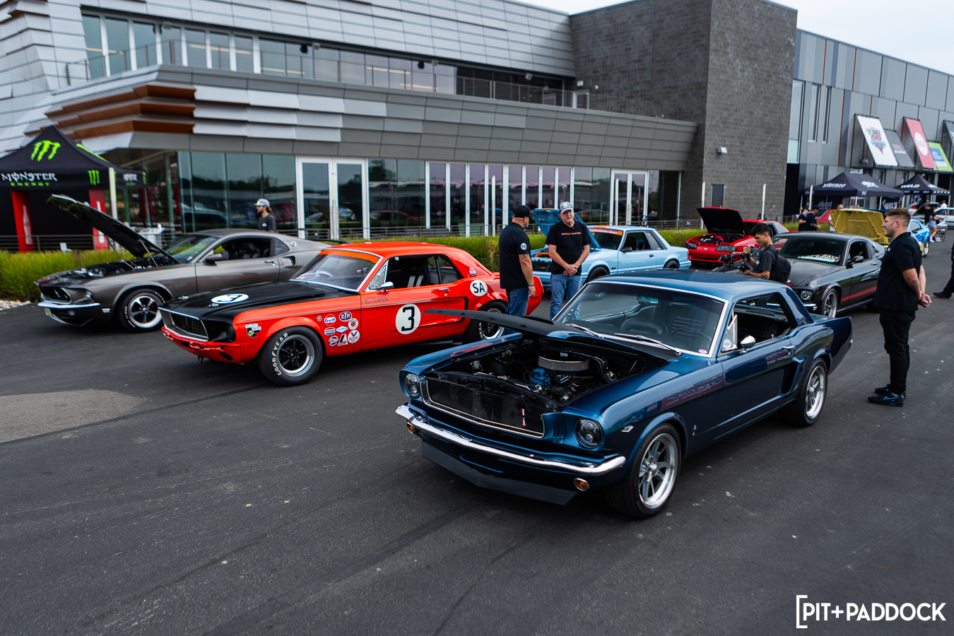 At the beginning of Pit+Paddock, we were admittedly very intentional about integrating displays that looked like starting grids; it helped us drive the point home about where our brand intersected. Since then, we can admit that it just looks incredibly cool. We lined the Mustangs up by generation—old to new—so that when spectators rolled through the gates, it’d be their first impression.