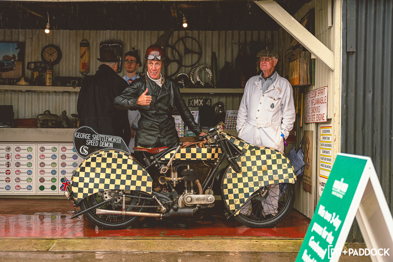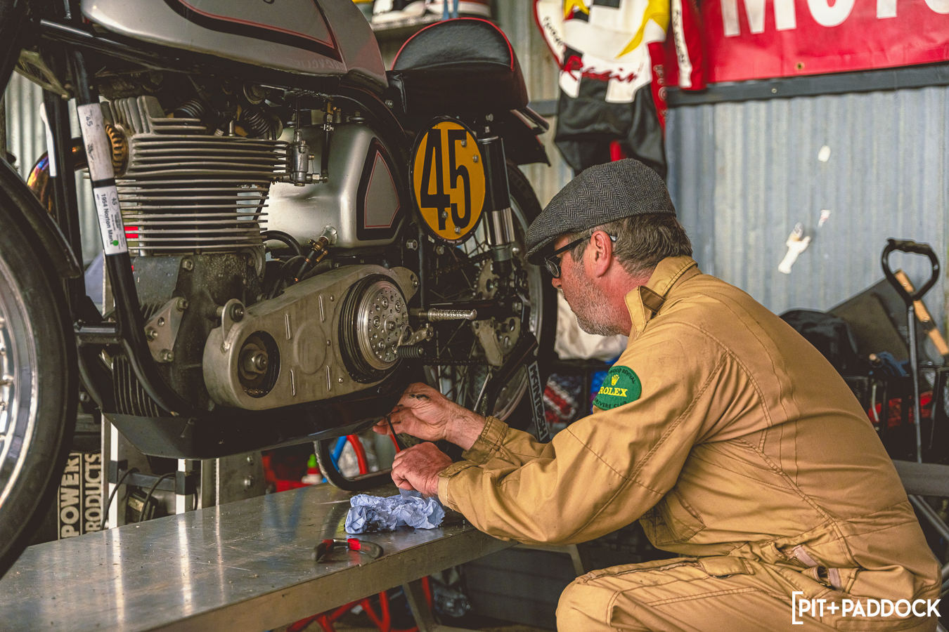 Part of the charm is that the mechanics are encouraged to wear period-correct overalls—as are the spectators—and even the paddocks are decorated with period-correct signage and posters. 2024 saw a collection of beautiful motorcycles on display around the paddock area like this Indian and Henderson pair, or the tiny B.S.A. and Excelsior for comparison.