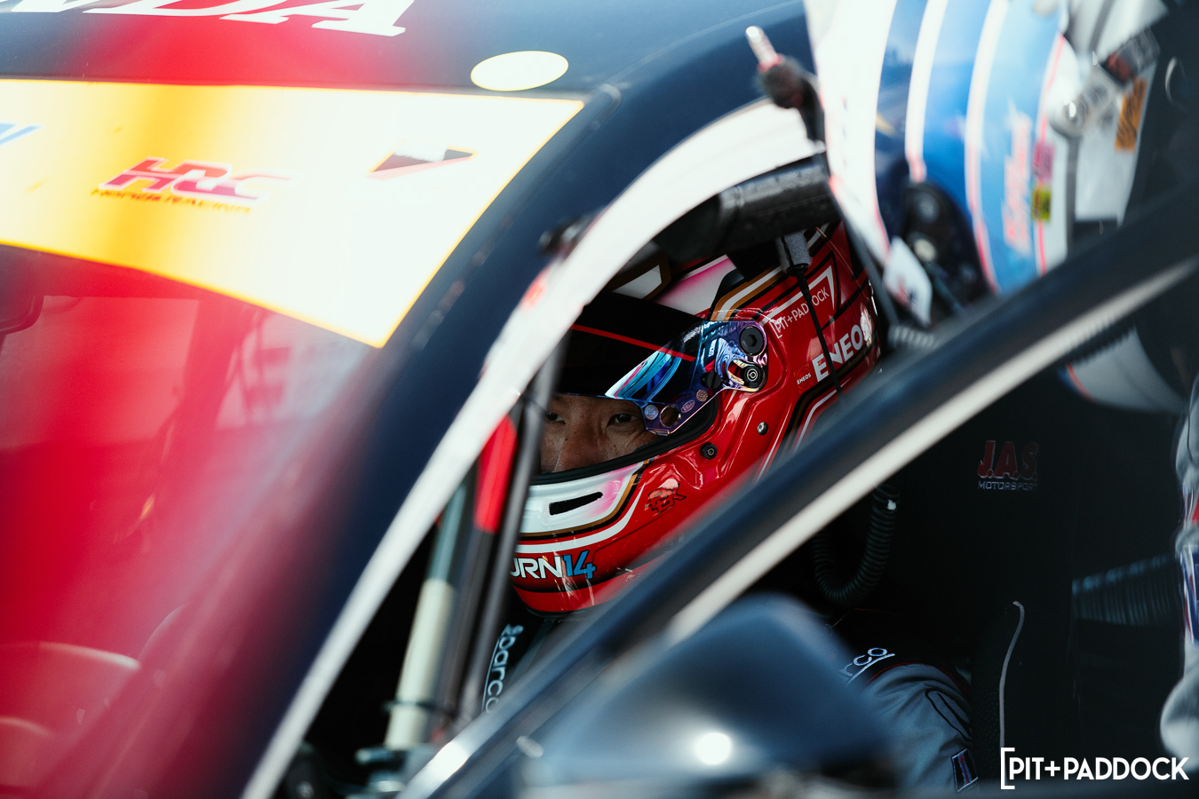 Yoshihara qualified the #93 Pit+Paddock Civic Type R TCR P5 for the Friday race behind four Hyundais. As the green flag waved, Yoshihara immediately went to work and stole P4. He’d have to stall his momentum forward soon after; contact between the #59 and #57 in GS would bring out the race’s first full course caution. The front-runner fighting in GS continued after race action resumed at 1:43. A three-wide shuffle between the #28 Porsche, #46 Aston Martin, and #50 Supra was a clear sign that everyone was putting everything on the table for the season finale. Full course cautions at 1:17 (and again just before the race’s midpoint) triggered a flurry of pit stops, including Yoshihara, who swapped driver duties with Wittmer during service.