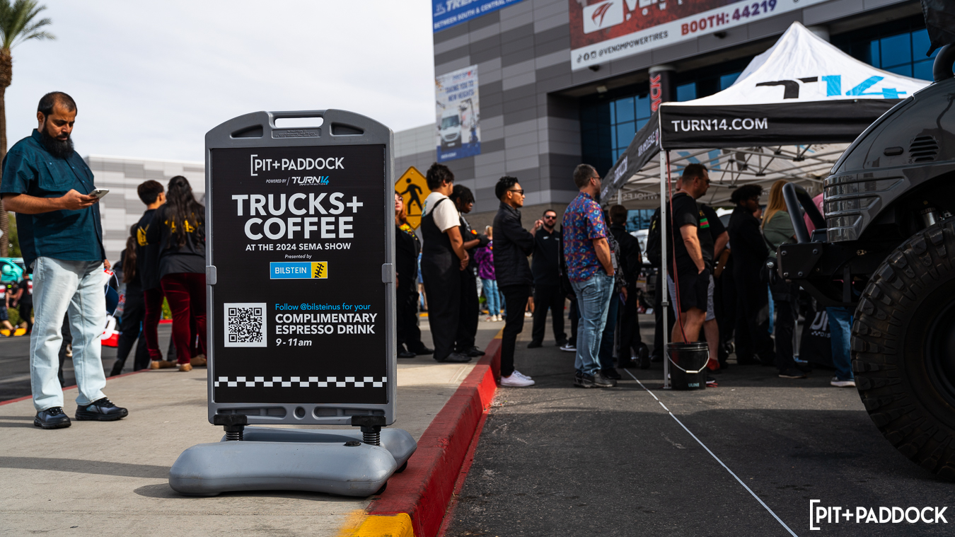 2024 has been an odd year. Anyone at SEMA right now can attest to that, too. Central Hall’s outdoor space is undergoing a major renovation—which has notably changed its familiar footprint—and the balmy Vegas winter that we four-season residents look forward to every November has been disappointingly missing. Indeed, a week of 45° mornings in Las Vegas is an anomaly. Fortunately, Bilstein has had the perfect solution for the trade show exhibitors, attendees, and truck fans alike: a trucks+coffee activation at Turn 14 Distribution’s outdoor booth (#84160) flanking SEMA’s South Hall.