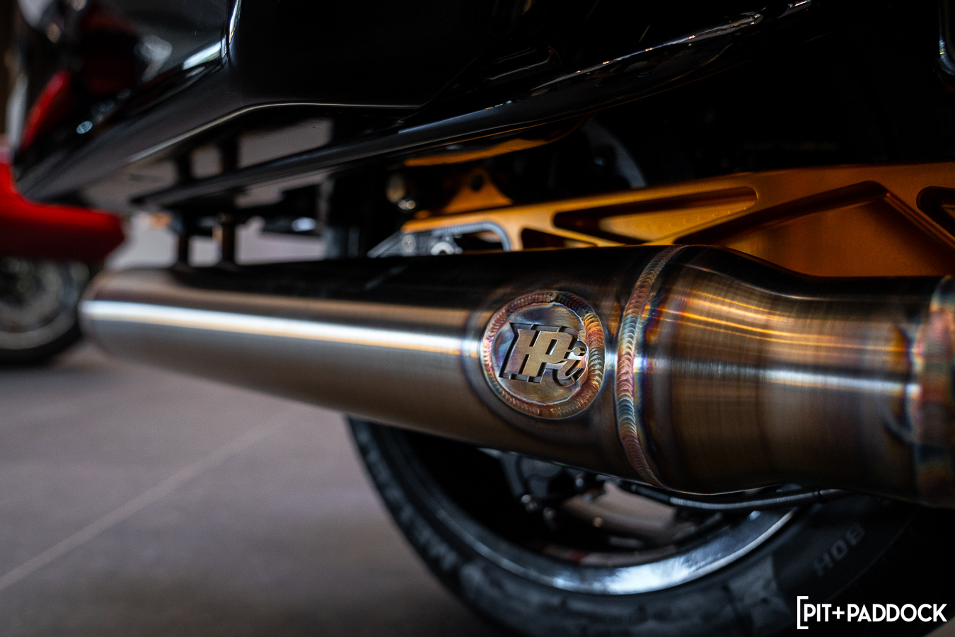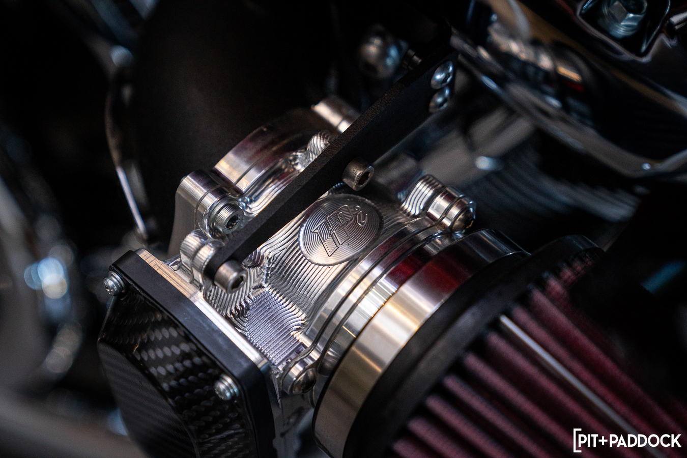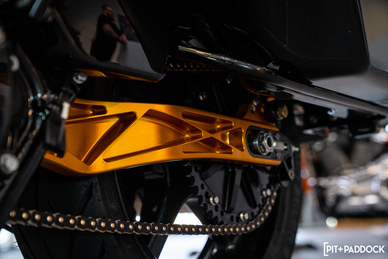 An Alloy Art chain conversion kit was a must to cope with the extra grunt, and the Speed Dealer Customs swingarm—anodized gold for good measure—draws your eye towards the critical upgrade.