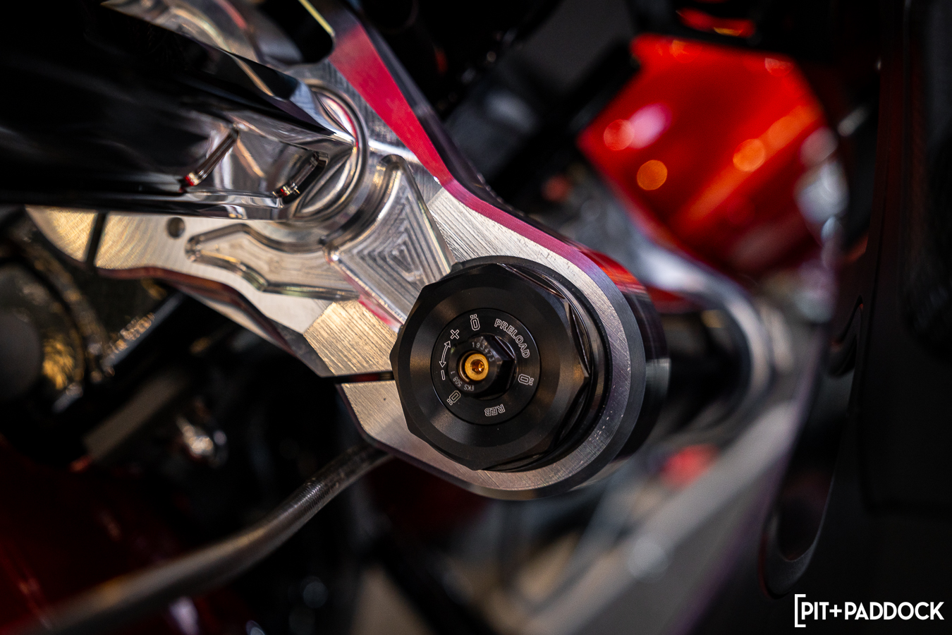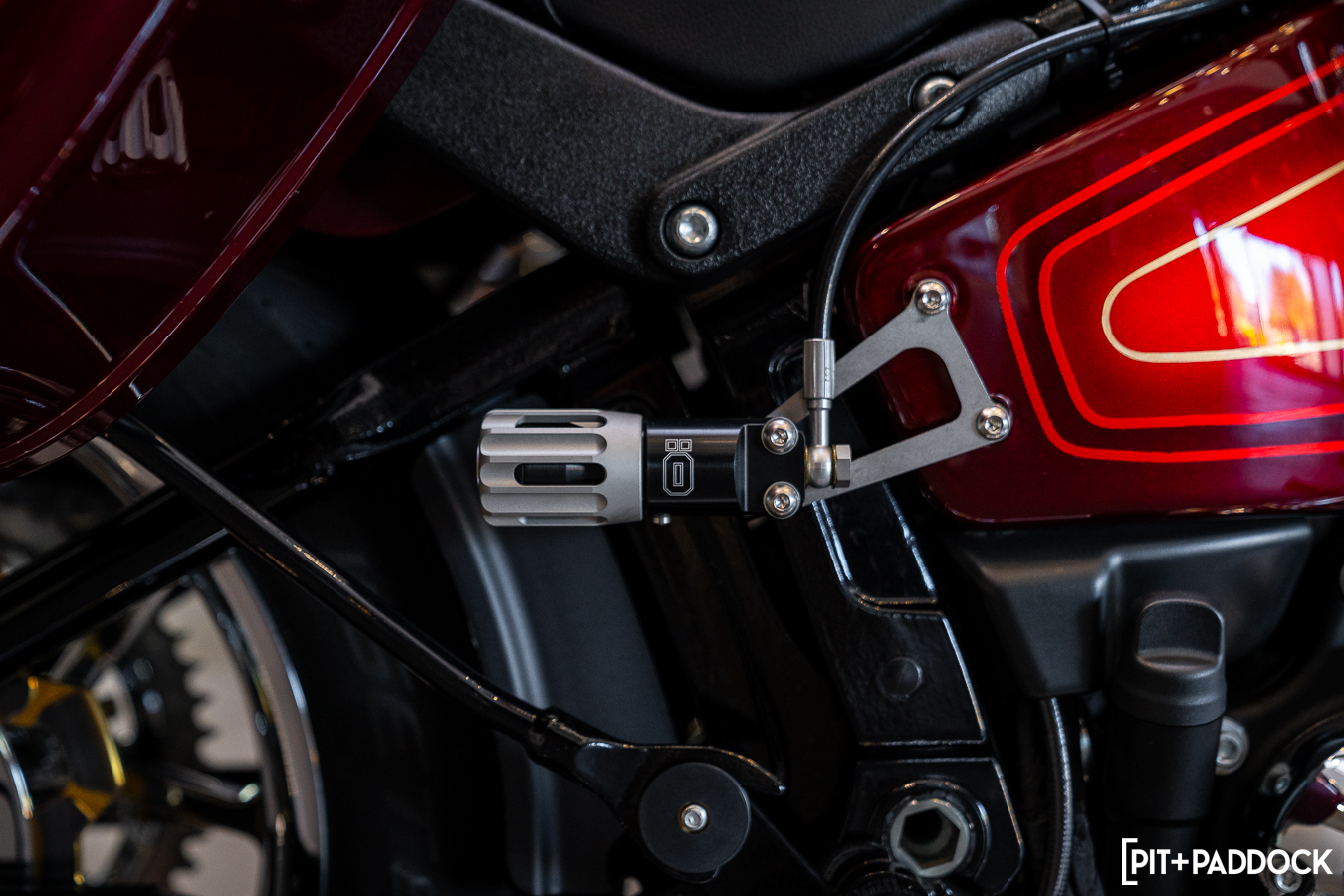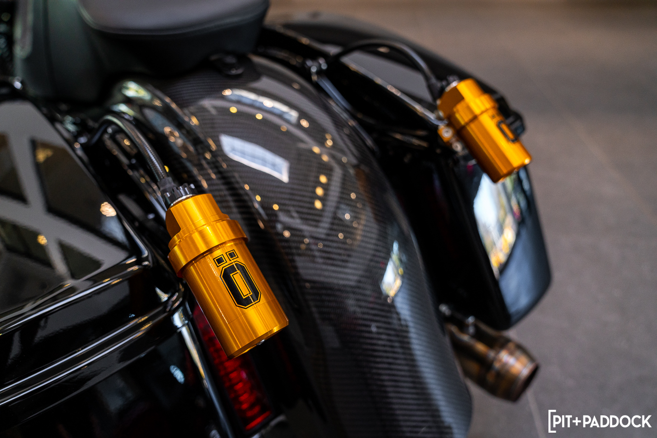 An Alloy Art chain conversion kit was a must to cope with the extra grunt, and the Speed Dealer Customs swingarm—anodized gold for good measure—draws your eye towards the critical upgrade.