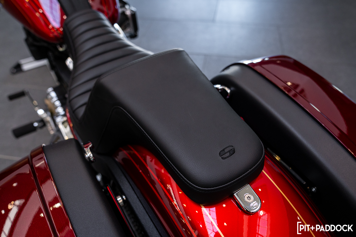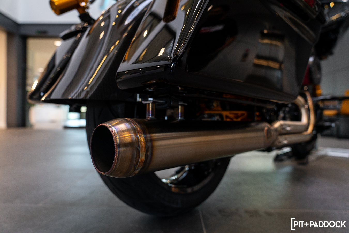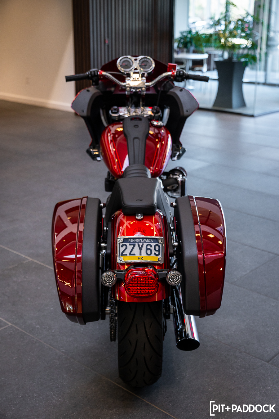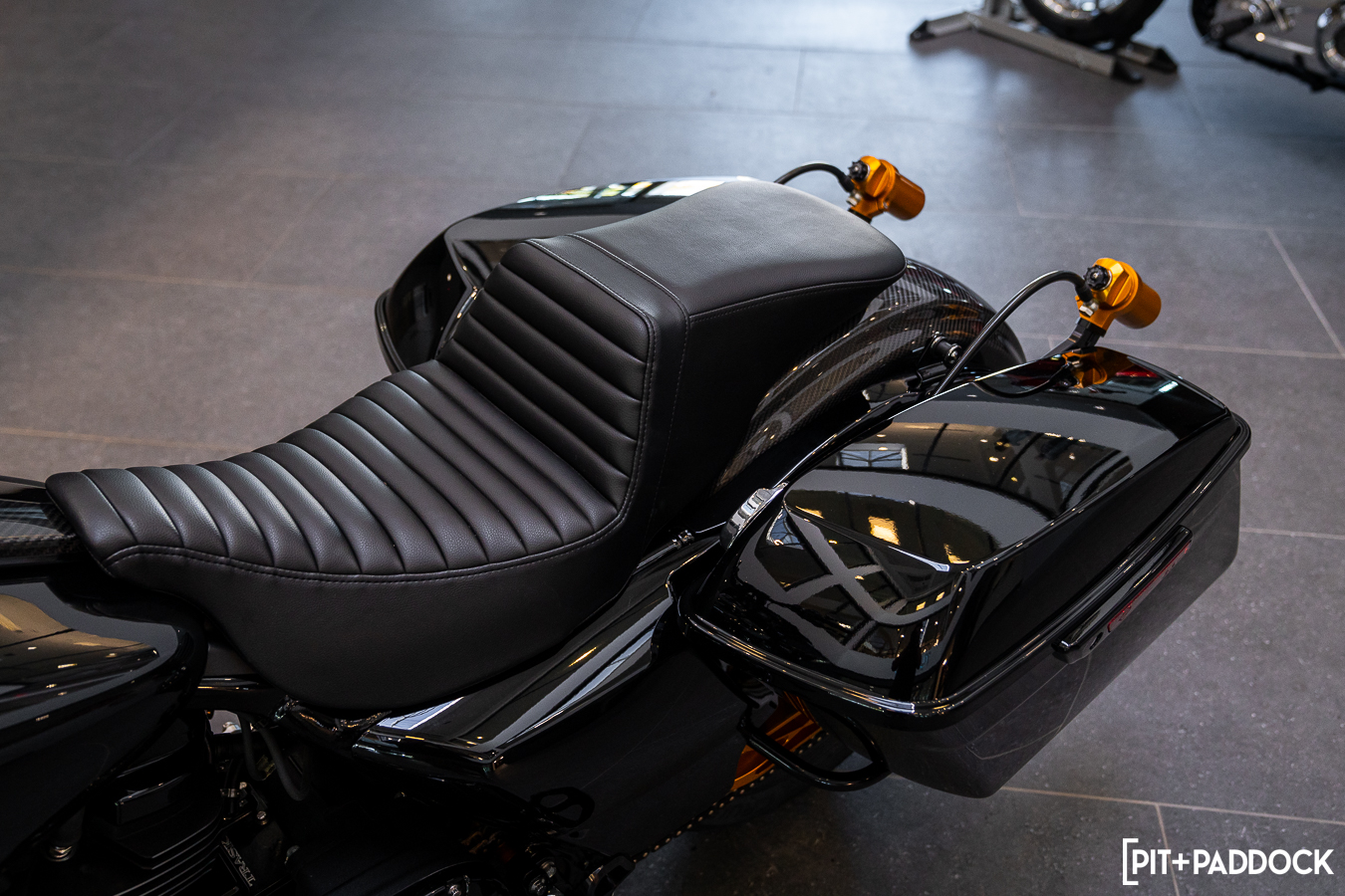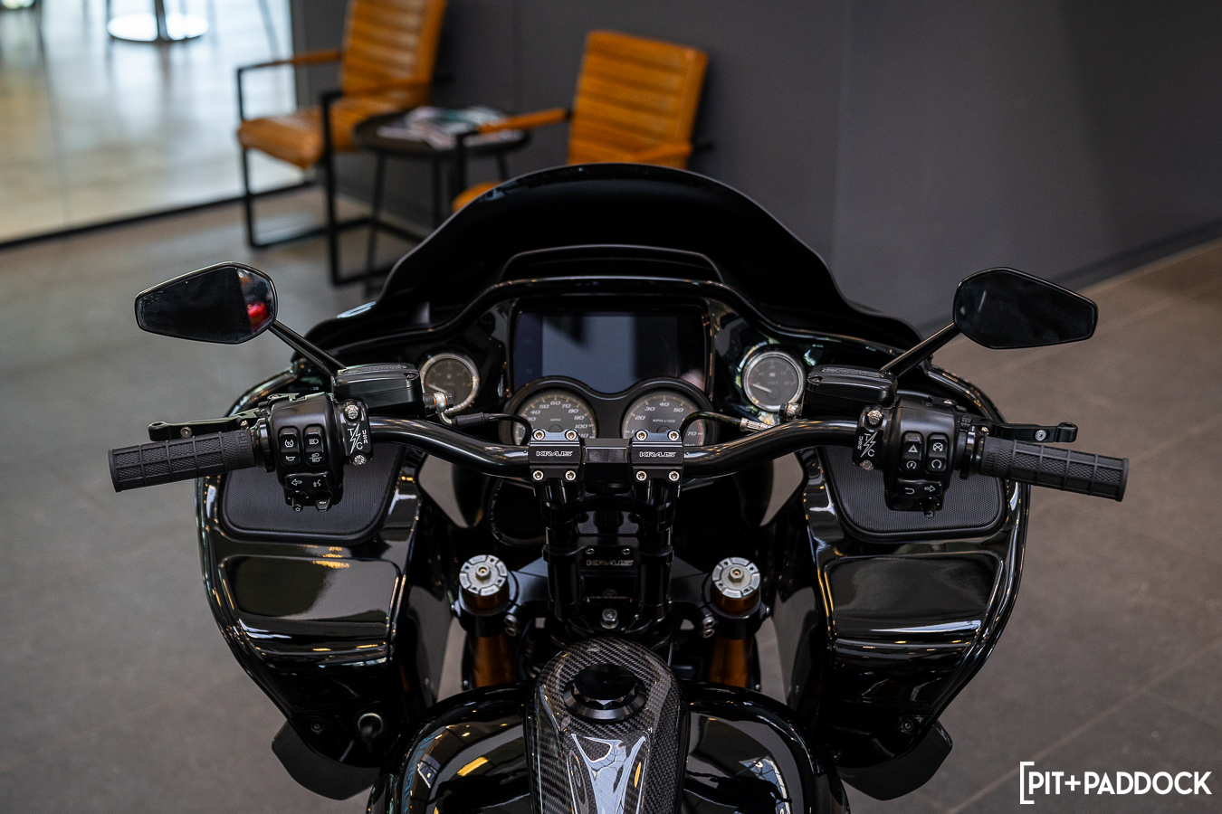 In contrast to the El Diablo, this Road Glide looks like a stealth fighter jet. BST Twin Tek carbon fiber wheels add to the black-on-black scheme while helping shave weight. A Beringer Aerotec 4D quad-disc brake setup was fitted at the same time. These four 230mm rotors offer slightly more braking surface than a single 320mm rotor, but that’s only part of the benefit. It also reduces the gyroscopic effect, which helps riders confidently attack corners on those tight and twisty roads without the bike wanting to stand up. It’s an important consideration on a bike that can hang with the best of them.