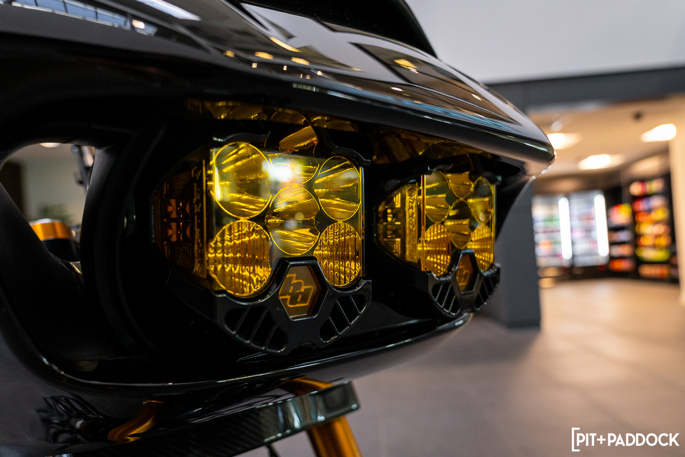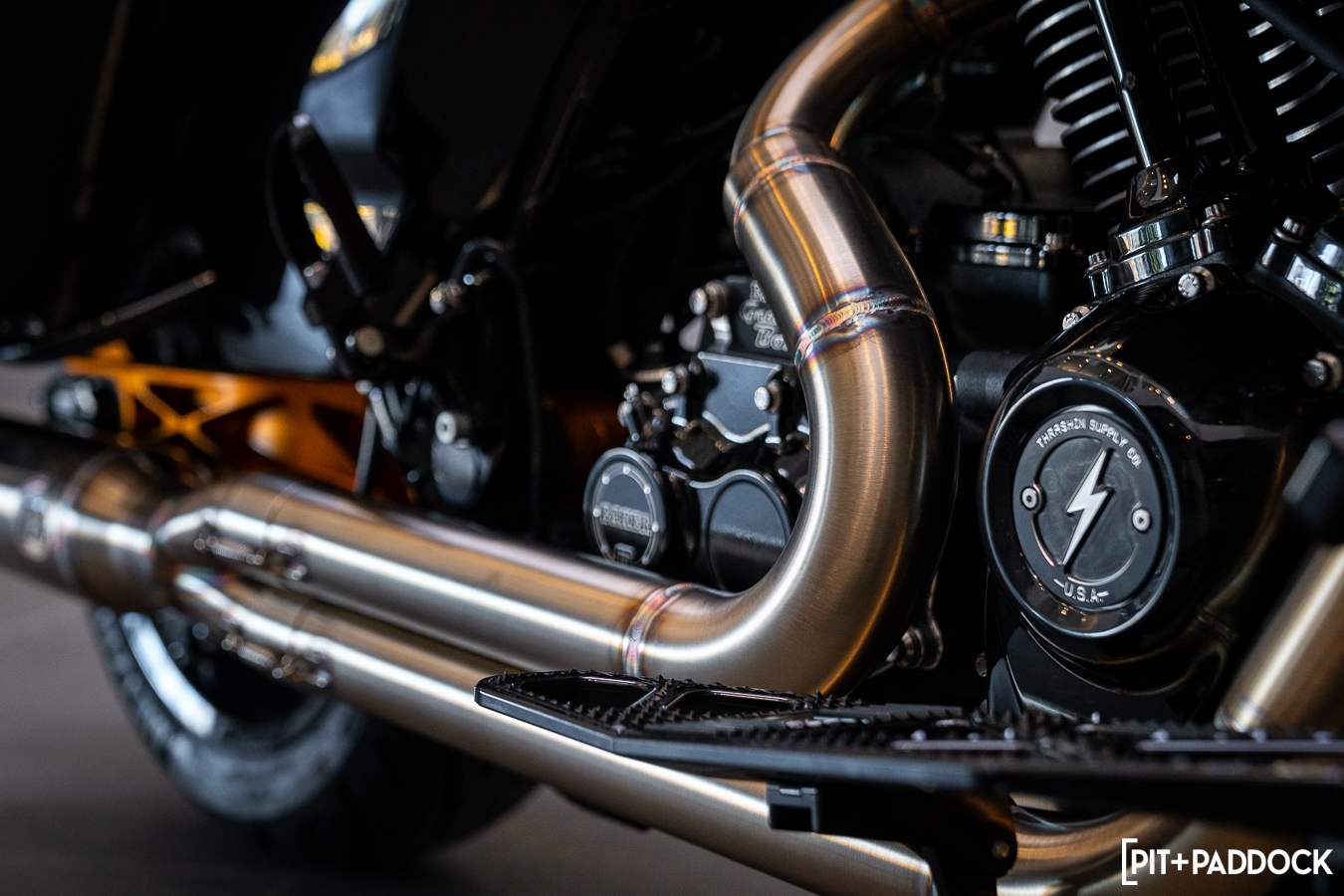 The bike that you see here builds on that momentum. GLC’s intent for this Road Glide was to go all-out—use the best possible products and pair them to a high horsepower, naturally aspirated engine. The heaviest lift for this build was, indeed, the powerplant. The stock motor was torn down and sent out to T-Man. When it came back, the no-longer-stock engine was fitted with an enormous 143” kit. What used to be a 78hp cruiser was now a 175hp monster. Yes, please. A custom Horsepower Incorporated exhaust system was fitted, too. Whereas the standard system uses 2” piping, this full-length one-off steps up to 2 1/4” to make sure this Road Glide could extract every ounce of that motor’s potential.