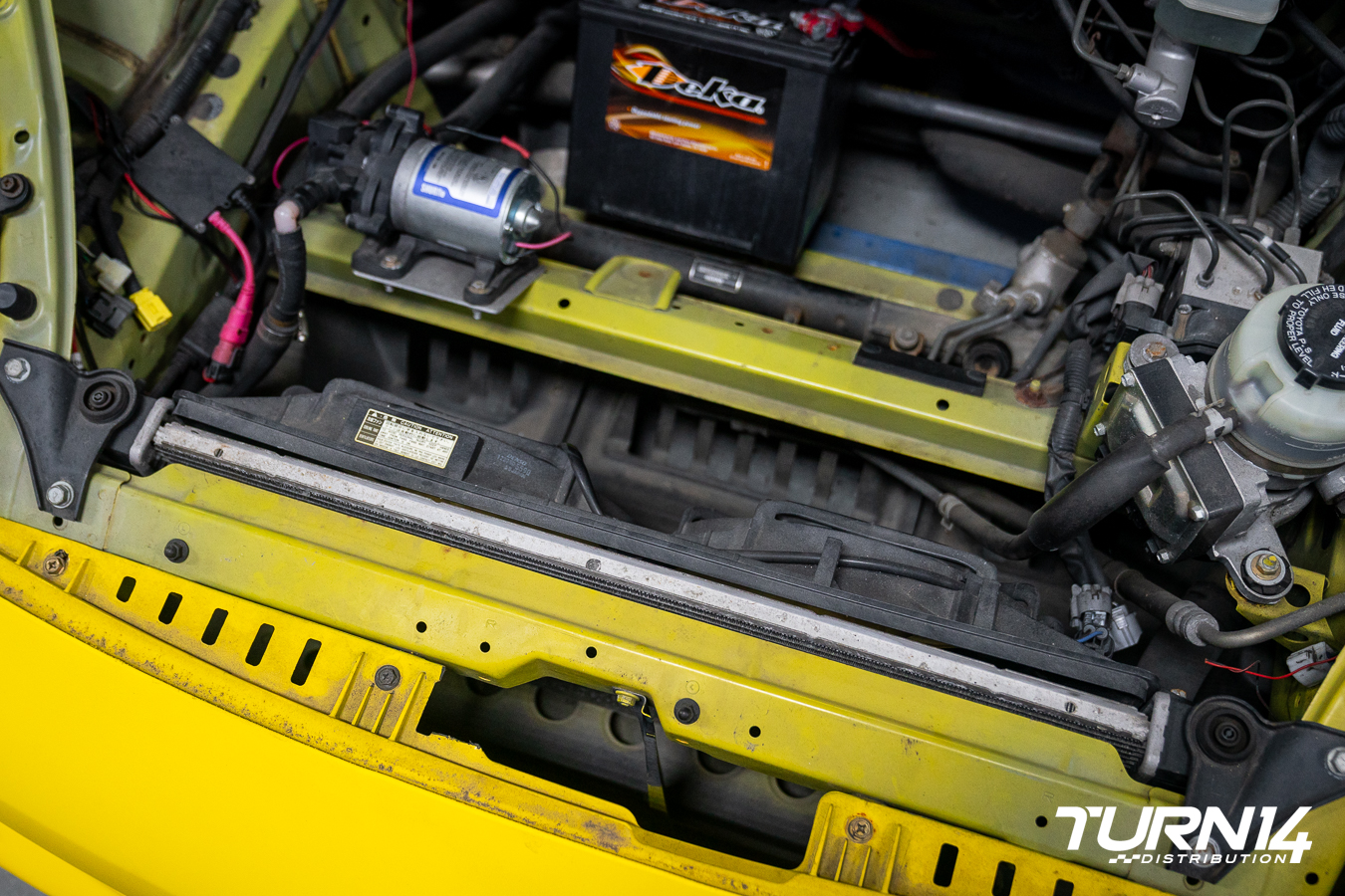 Cooling is one of the MR2’s most critical systems. With the engine in the back and the radiator up front, coolant has to travel a long path, and factory components start to show their age quickly under stress. That’s what led Erik to upgrade to a Koyorad all-aluminum radiator.