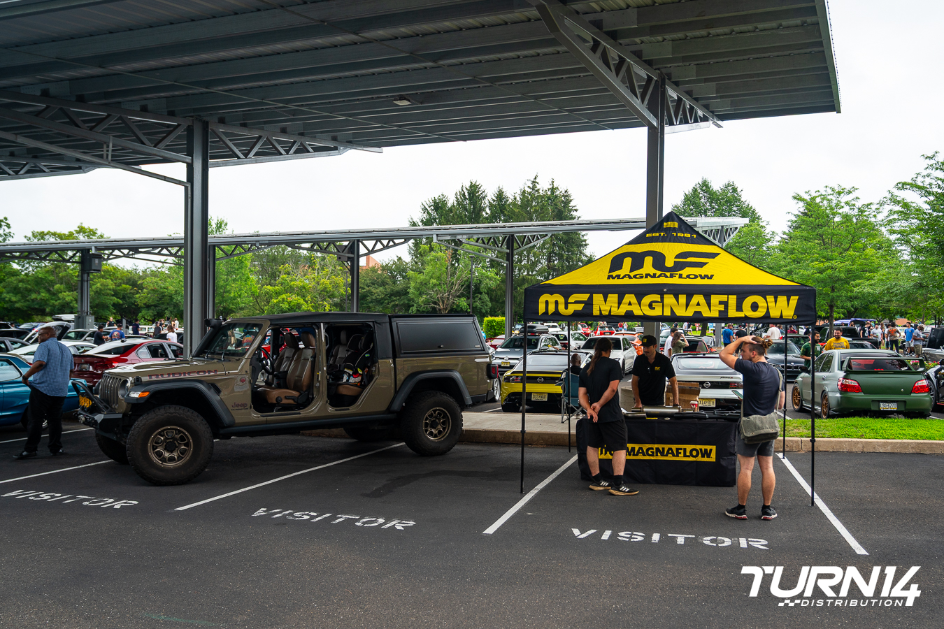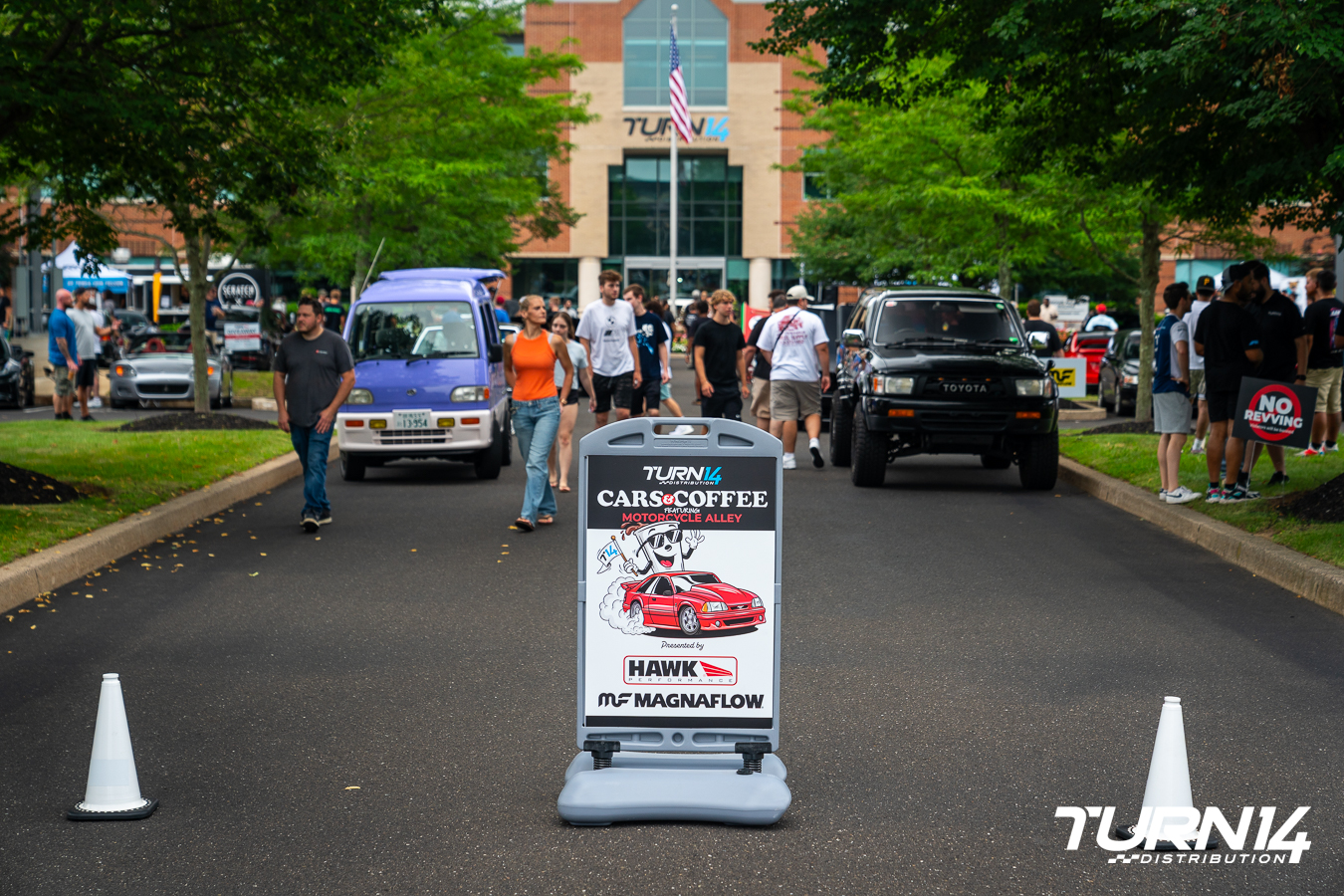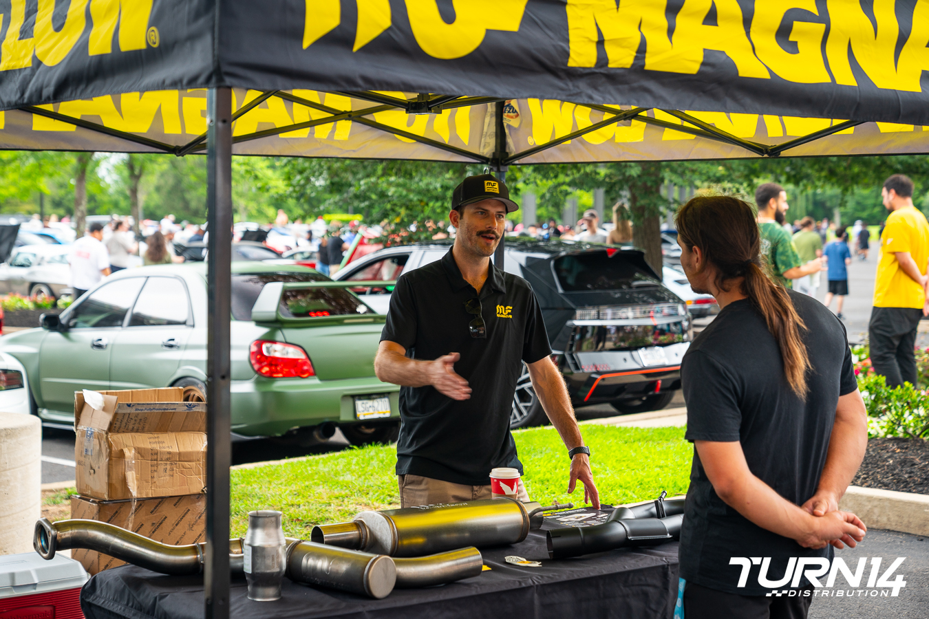 MagnaFlow’s longstanding dedication to automotive enthusiasts and performance made them a welcomed partner at our Cars & Coffee this July. Its booth showcased a standout display vehicle, a tastefully modified 2020 Jeep Gladiator owned by Turn 14 Distribution’s own Ryan Evans. The build featured Mamba M19 wheels, 37-inch BFGoodrich KO2s, Baja Designs LP9 front and Squadron rear lights, and a MagnaFlow Rock Crawler Series Cat-Back exhaust. Throughout the day, attendees engaged with the MagnaFlow team to learn more about the advantages of high-performance exhaust systems and how they can enhance sound and efficiency on and off the road. Attendees also walked away with MagnaFlow stickers and merchandise.