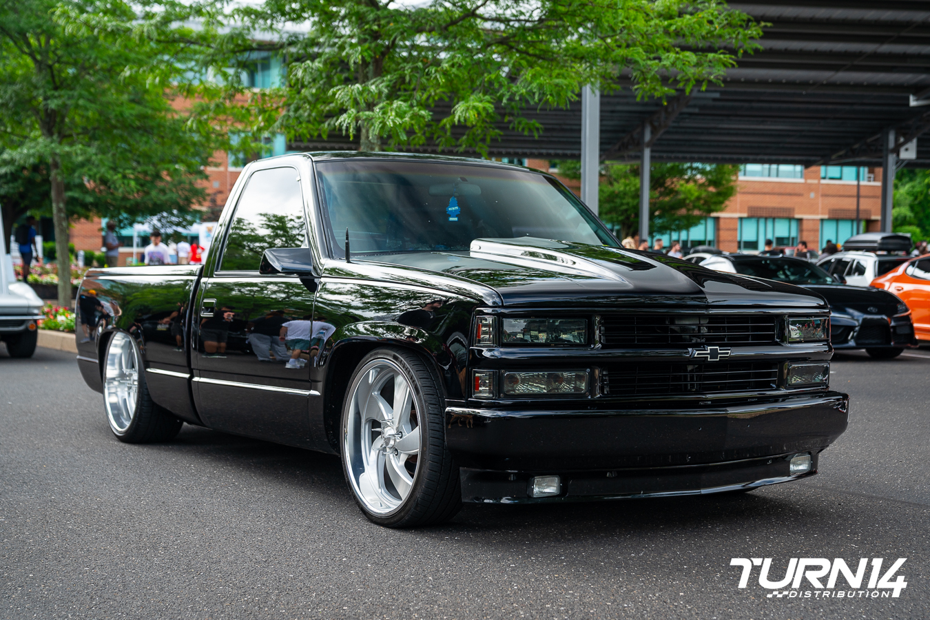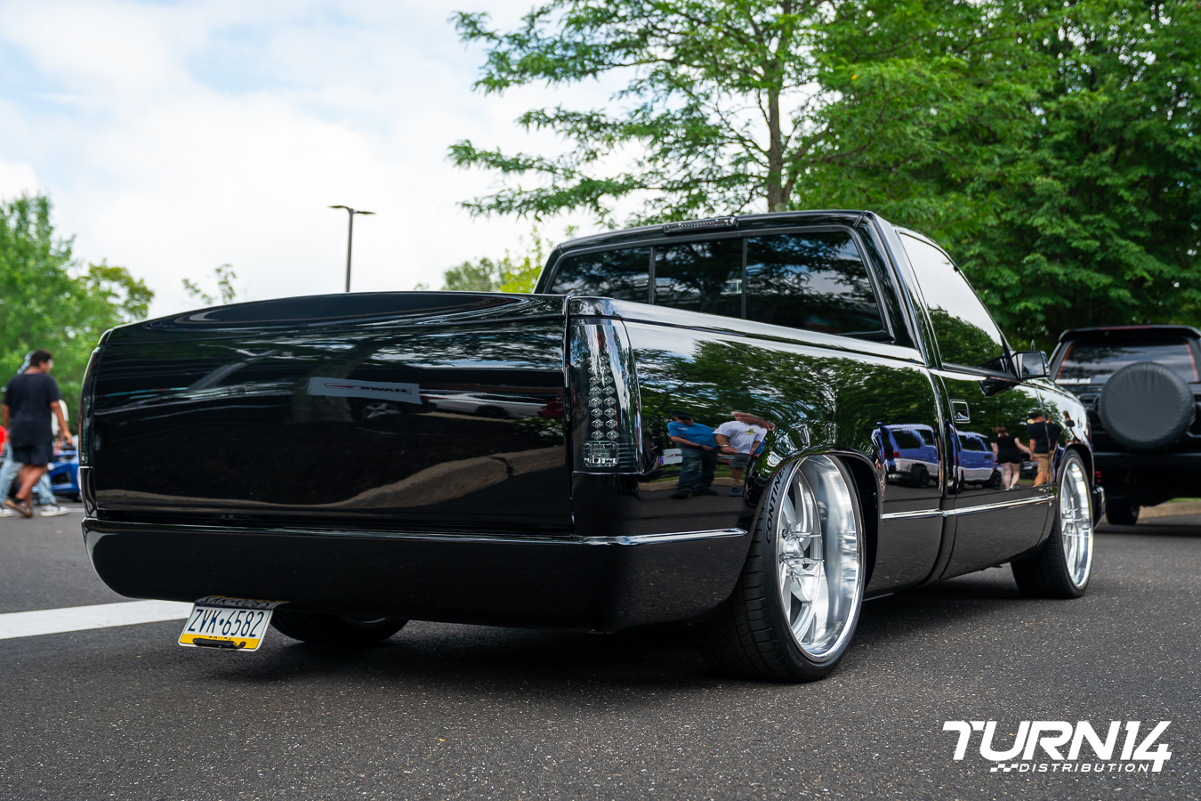 Forrest Bowers brought out a standout custom 1994 Chevrolet Silverado C1500 truck that turned heads with its clean craftsmanship and attention to detail. Built in collaboration with Jacob’s Auto Body and Customs, the truck underwent a full repaint and received a replacement bed sourced from Texas. Forrest treated the underside with POR-15 undercoating, with subtle finishing touches added for extra refinement. Exterior modifications include a welded roll pan without a plated bezel, a shaved tailgate handle, an Eckler’s hood flip kit, and custom wheel wells designed to accommodate 22×11 US Mags in the rear and 22x10s up front. The stance comes courtesy of a 5/9 drop with a frame notch, supported by rear airbags for added flexibility. Additional upgrades include a 454 SS front valance, matching fog lights, and a cowl hood, all sourced from an original 454 SS. Minor but impactful cosmetic enhancements, like VanNatta Fab engine bay shrouds and custom Vhautohaz badge lighting, complete the build, making it one of the cleanest and most cohesive trucks on display.