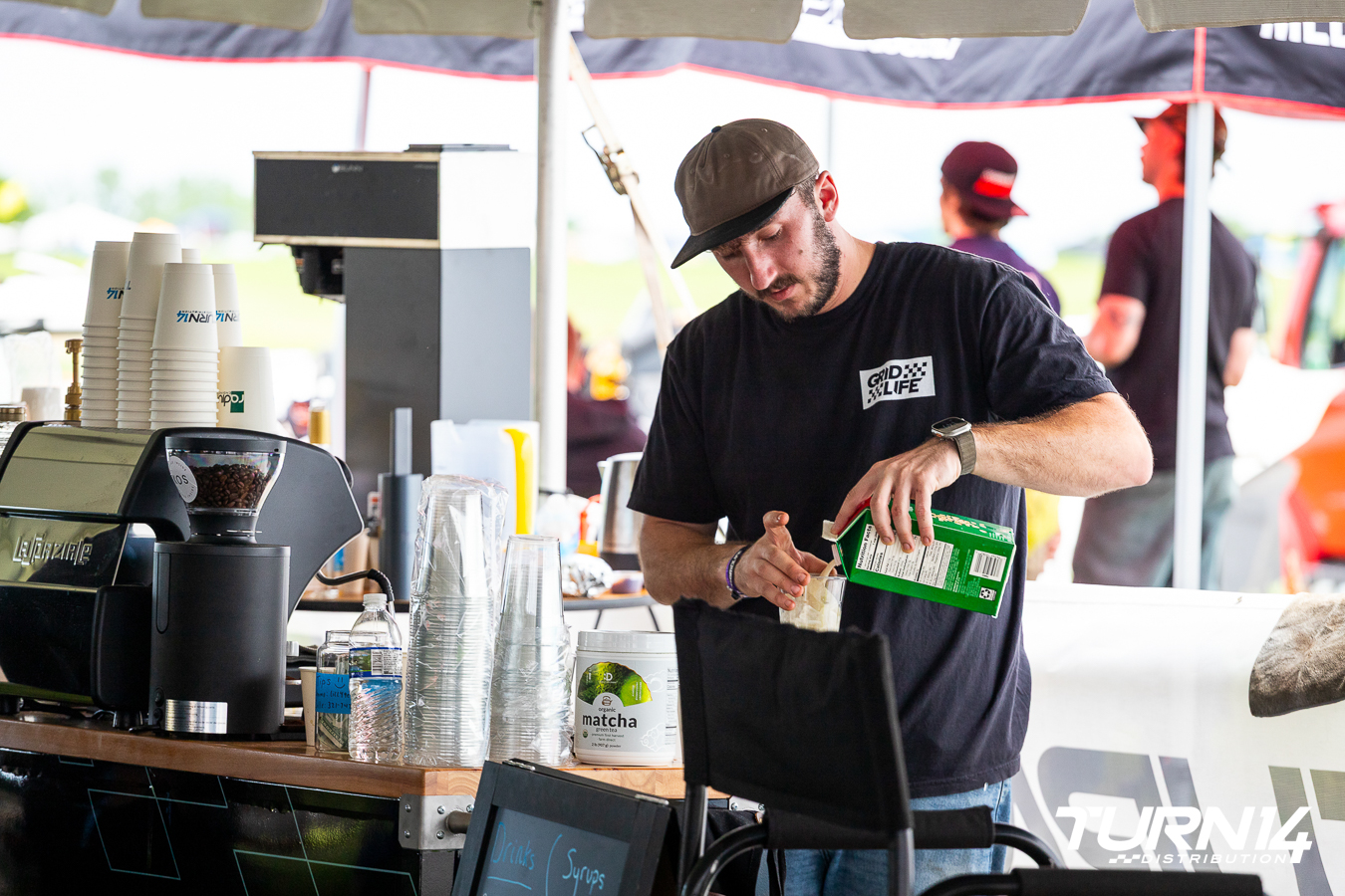 GRIDLIFE kicked off the 2025 season at Carolina Motorsports Park, with competitors and spectators eager to come out of winter hibernation. The racing action was intense, as track conditions varied wildly through the day with cool mornings giving way to warm, southern afternoons, and, of course, the occasional afternoon thunderstorm. The Turn 14 Partner Lounge debuted with a clear view of Turn 1, and the livestream on a big screen to follow the action around the track. The Lounge provided welcome morning warmth in the form of hot coffee, espresso, and assorted handcrafted beverages from a skilled barista, the owner of Sidecart Coffee in central Florida, who we are proud to have for every round this season. As the morning dew gave way to afternoon sun, the drinks turned iced and the tent provided welcome shade for our customers and partners.
