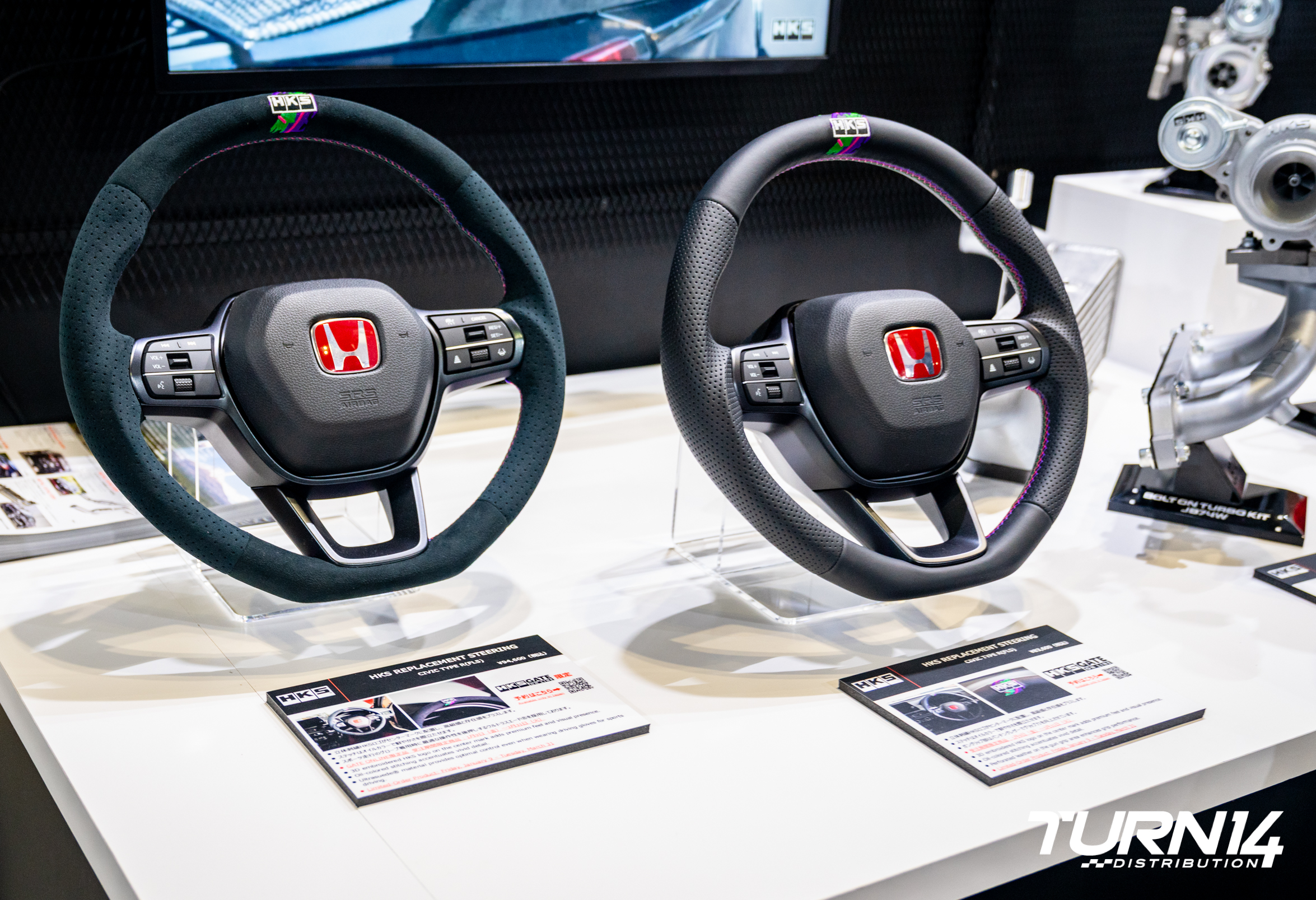 After getting a preview of HKS’ future, we arrived at Tokyo Auto Salon for the full view of the present. First up, replacement OEM steering wheels compatible with the new Toyota GR Corolla and the FL5 Honda Civic Type R for a simple but noticeable upgrade. These offerings are a quick way to subtly incorporate premium leather or suede, the HKS logo, and oil-splash stitching into one of the driver’s main touch points. Next was the renewed vigor of the Hipermax S coilover suspension system, which features improved durability with new gold details to differentiate from the Hipermax R. This product offers an easier, more street-friendly ride with release applications including R32, S13, Tesla Model 3, and others.