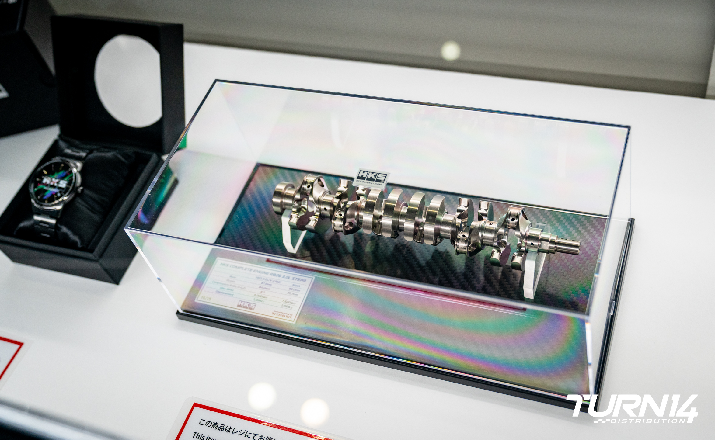 An attention-grabbing announcement and center stage of its booth, HKS’s F-Con V Pro Ver 3.4 ECU and its full collaboration with Defi’s new HKS Sports Display F to replace your car’s ordinary instrument panel. Pair this ultra-cool setup with the new HKS Advance Link Meter Set for the ultimate gauge display experience. The backlight color harkens back to the golden era of orange/amber interior displays for period-correct visuals. Finally, HKS also showcased its newest merchandise, and this adorable miniature RB30 crankshaft, a representation of what would be included in HKS’s complete RB26 3.0-liter Step 3 engine.