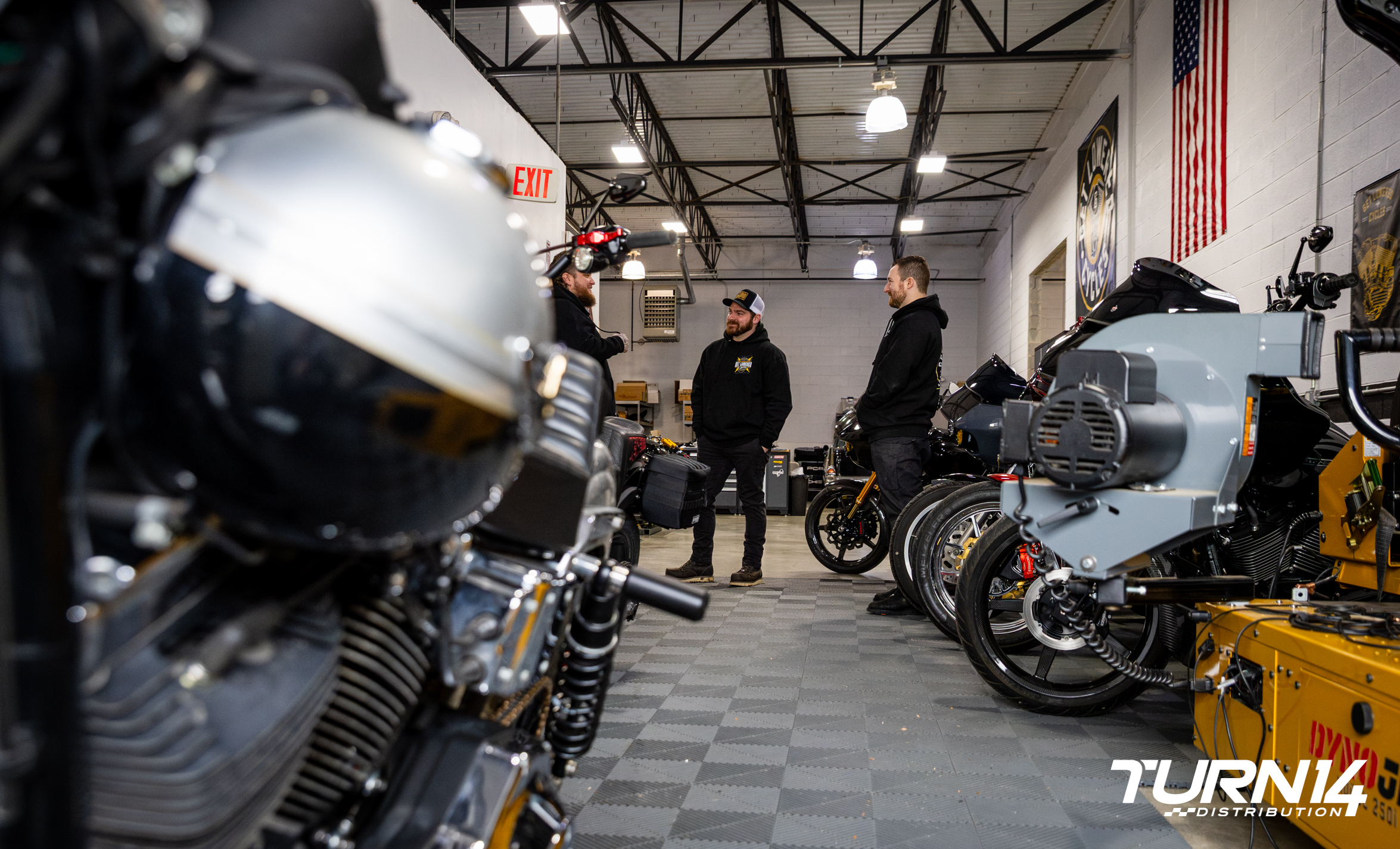 Nestled within an industrial park, the shop’s unassuming exterior gives way to a focused showroom that immediately tells you what it’s all about. Lined with product displays, an array of popular helmets, and complete with two eye-catching custom builds, the message is clear: we sell performance. That theme is further amplified by the large window offering a front-row seat to the stable of builds and a rolling dyno.