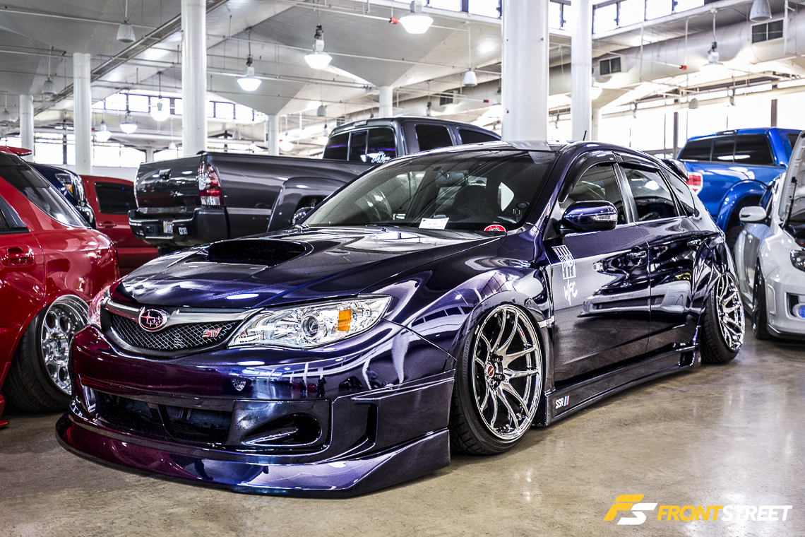 The addition of a full Chargespeed lip kit elongates this deep purple Subaru STI’s body, while an air suspension setup hovers the body directly over a concave set of polished Work Emotion Kiwami wheels.