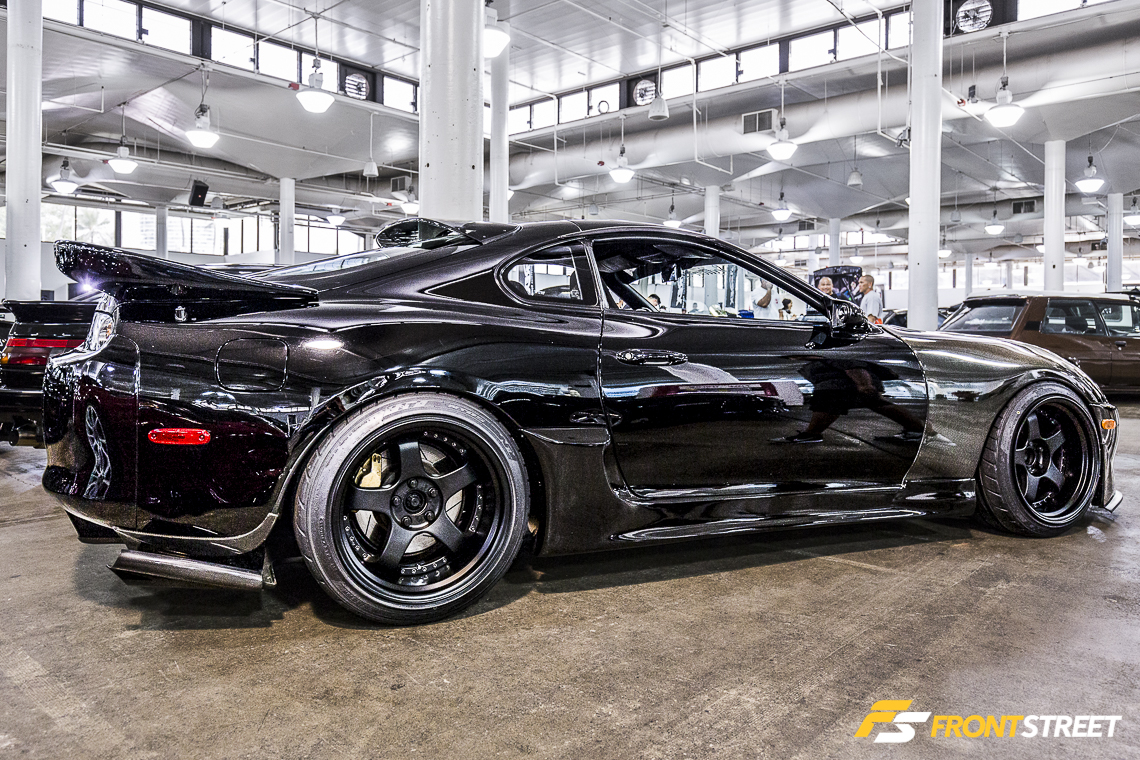 Its open hood displayed the 3.0-liter 2JZ-GTE engine, which has been converted to a large single turbocharger setup over the factory twin-turbo forced induction.