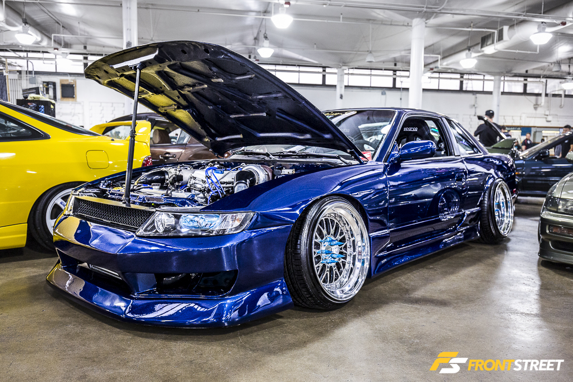 Freshly cleaned, yet ready for drift action, this 240SX wears a two-tone paint scheme with beige paint on an URAS Aggressive style kit; it’s adorned with glittering black paint on the hood and roof.