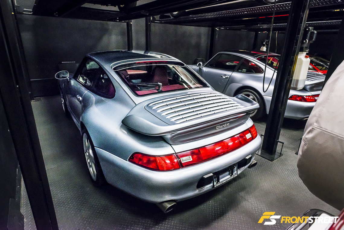 A pair of identical hand-built Porsche 993 Turbo machines reside in the shadows underneath another row of cars. With an ever-rising price tag, as the last of the air-cooled 911 models, these 400 horsepower twin-turbocharged rockets are more of an investment than negotiable stock.