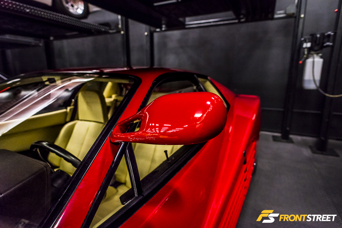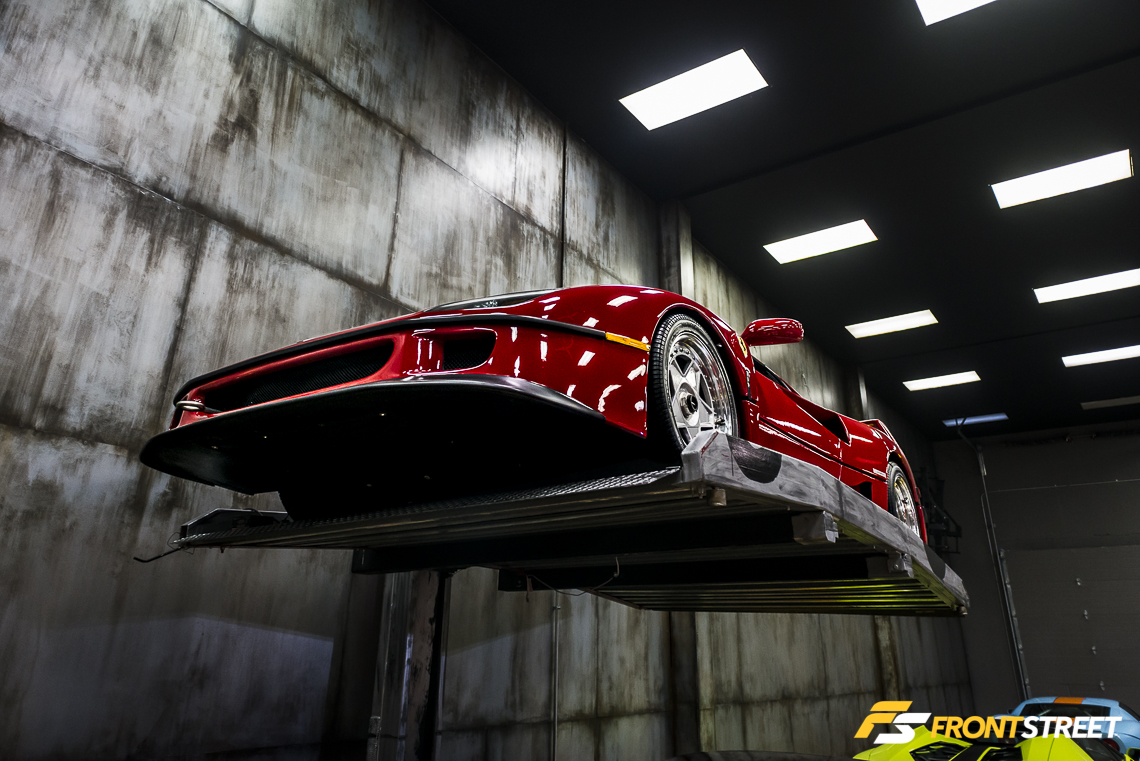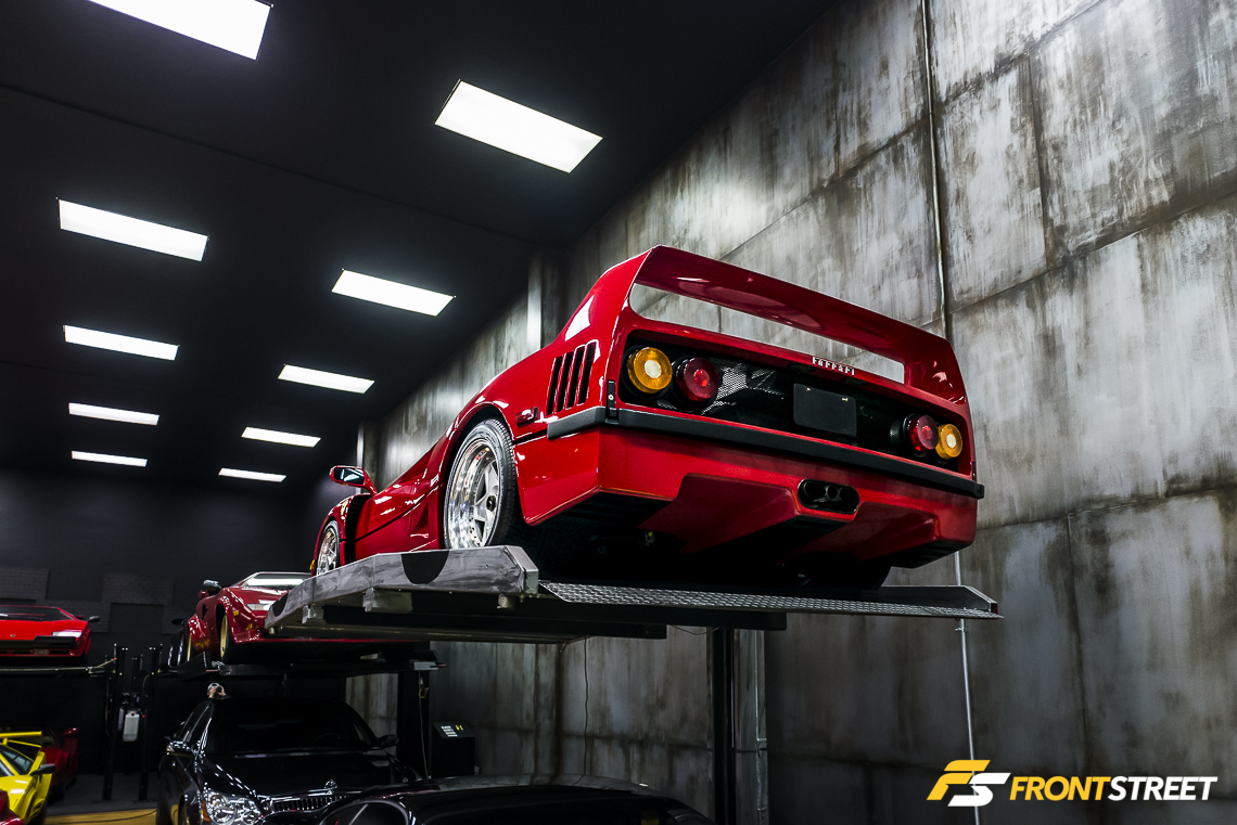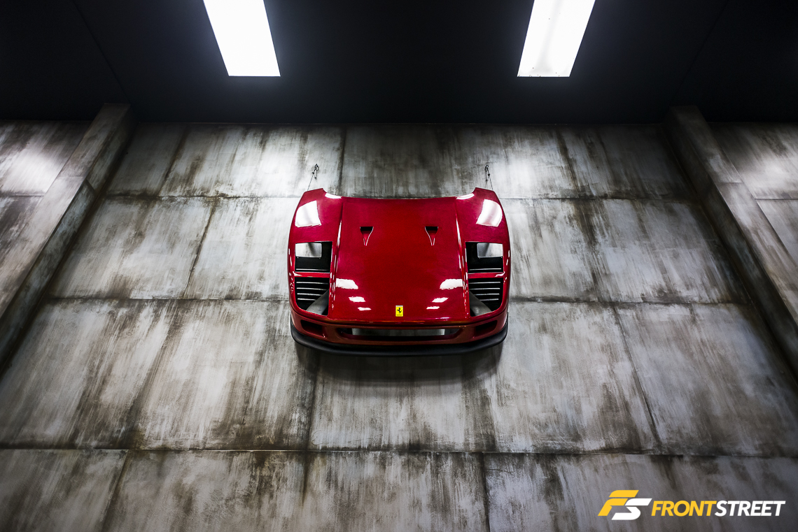 Elevated above the floor via its own lift, posed an automotive mixture of carbon fiber and red paint known as the Ferrari F40. With a curb weight around 3,000 pounds, Ferrari adopted a weight-saving strategy of spraying the paint very sparingly over the carbon fiber body to the point that it was possible to see the fiber’s weave protruding through its red coat. The vehicle’s lightened weight combined with a 470 horsepower twin-turbocharged V8 engine made the F40 the pinnacle of road car performance in its day; even today, the animalistic nature of the F40 is highly sought-after by enthusiasts looking to enter the arena of Ferrari ownership.