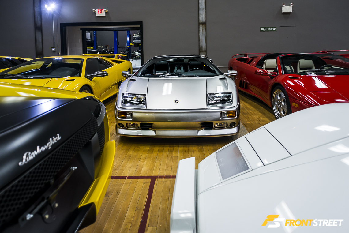 The hardwood floors are a product of the building’s previous life as a racquetball and fitness center. The owner of Interstate Motorsport, Steven Waldie, saw the opportunity to restore the location to its current condition and fill it with exotic automobiles. If it were a toy store, it would witness countless hysterical children, pleading to take home their favorite one. Even as an adult, it evokes the same emotion.