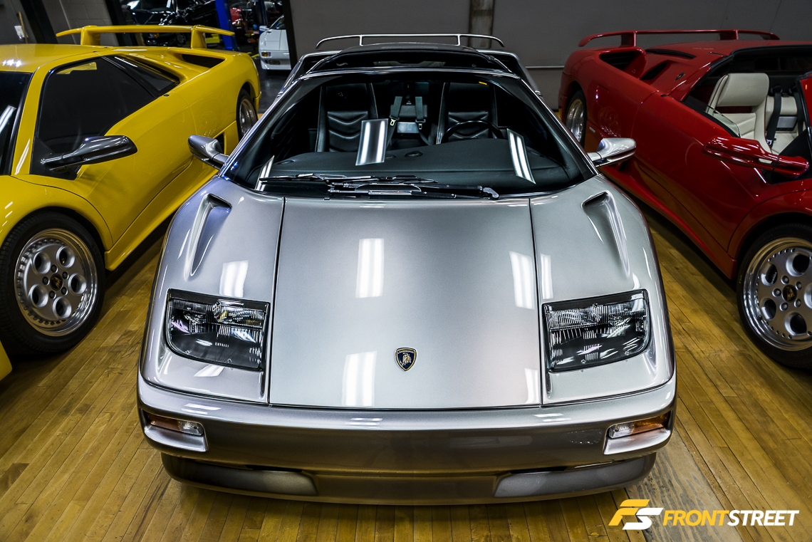 In 1999, Audi overhauled the Lamborghini Diablo by improving the interior with a modern dashboard, then cleaning up the exterior by removing the dated flip-up headlights. This particular Roadster VT sports the improved aerodynamic look, which sets it apart from the rest of the older Diablo cars in the building.