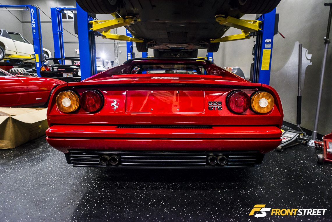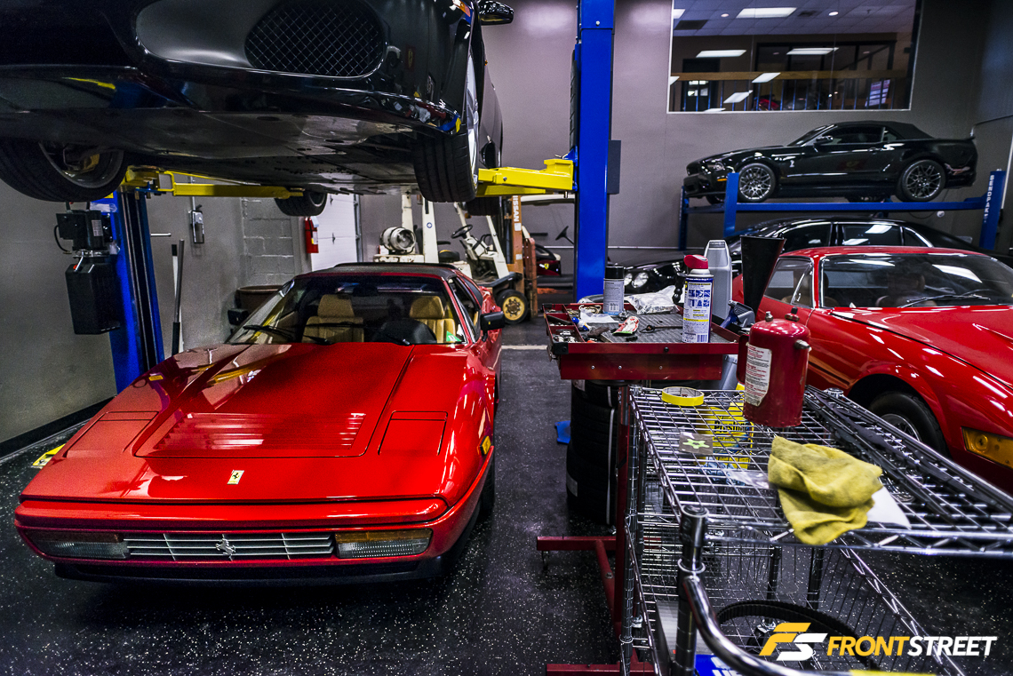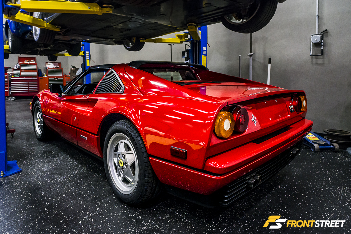 Amongst the vehicles being serviced were a pair of red Ferrari classics. This completely spotless Ferrari 328 GTS has such aggressive styling, bearing some of the same trademark ductwork as the famed GTO.