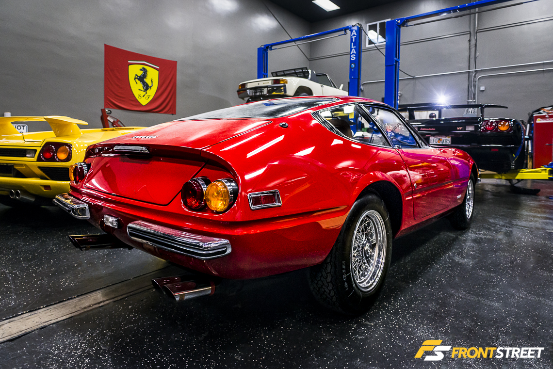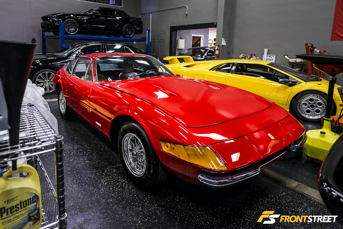 This Ferrari 365 GTB/4 Daytona lay gleaming in the middle of the service room. These cars were blessed with a 350 horsepower DOHC V12 engine, and received their nickname after Ferrari finished 1-2-3 in the 1967 24 hours of Daytona. This particular example had a plush period-correct beige leather interior that oozed class.