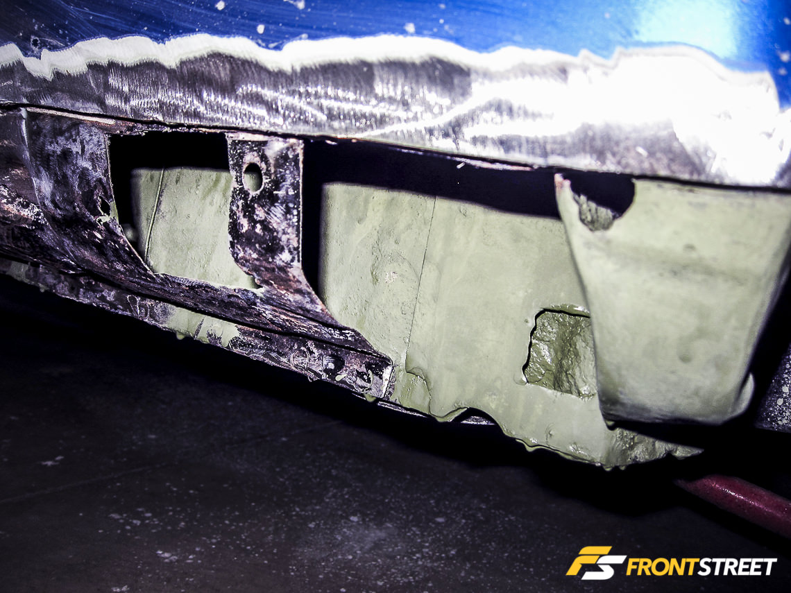 Our fears became reality when we noticed bubbling from under the paint. The previous owner decided to patch up the rusted area with body filler, which was a temporary solution; all it took was an incision with the chop saw to reveal the grim discovery. If you find rot on your automobile you will probably need the assistance of a fabricator or will need to replace the part or panel all together. Luckily, we were able to source OEM replacement panels for both driver and passenger sides from a donor car.