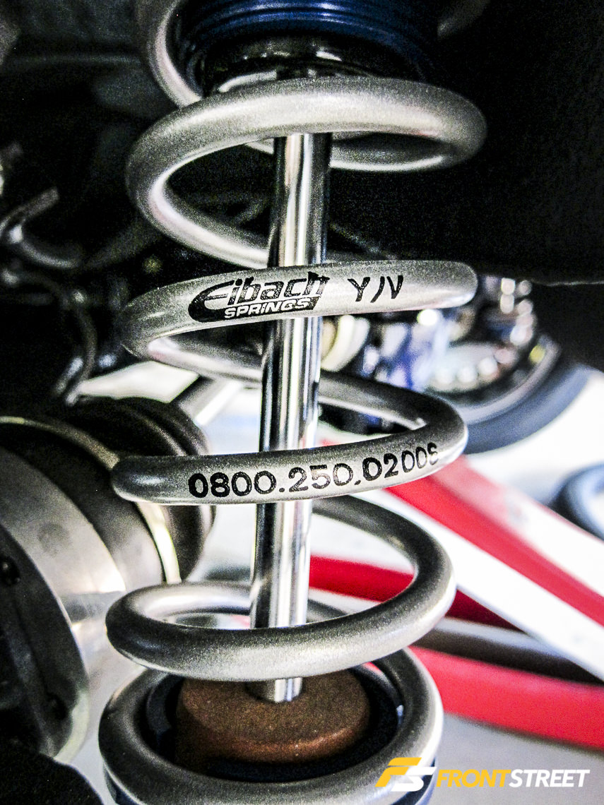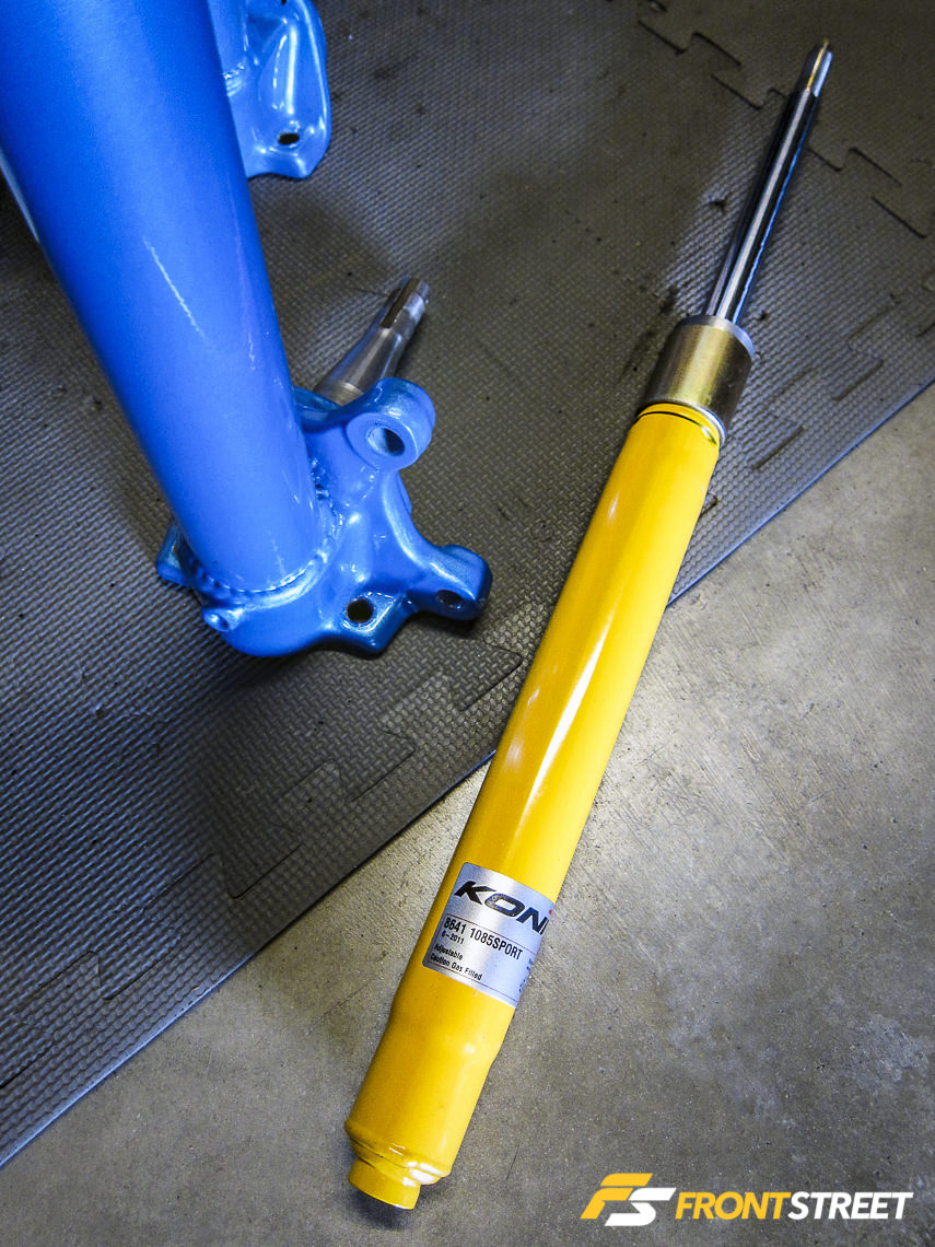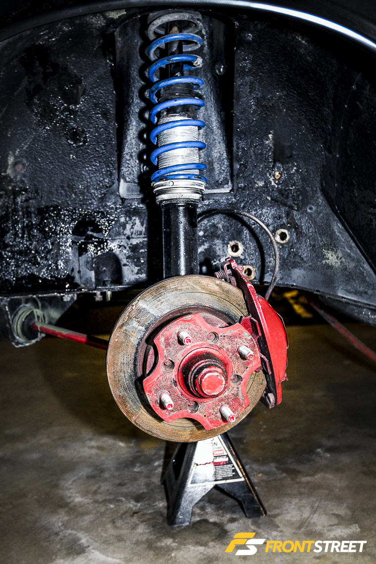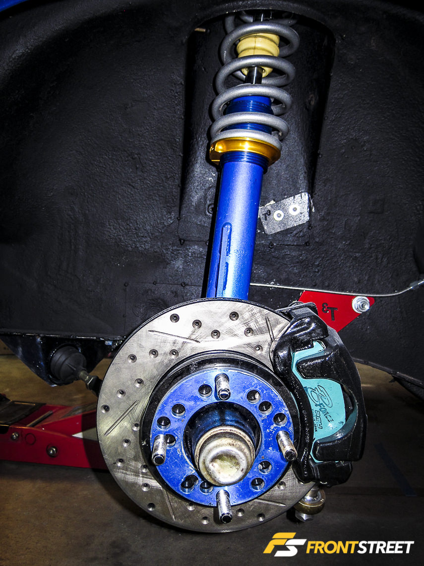 The GC coilover setup uses Eibach race springs, aluminum adjuster sleeves, and gusseted strut supports. We went one step further and had GC powder coat the setup in blue to match the car, and powder coat the springs in silver to provide a nice appearance contrast. Although 375 pound/inch coilover spring rates sound high, we took into consideration how heavy our engine and transmission combination would be in comparison to the factory L16 powerplant.