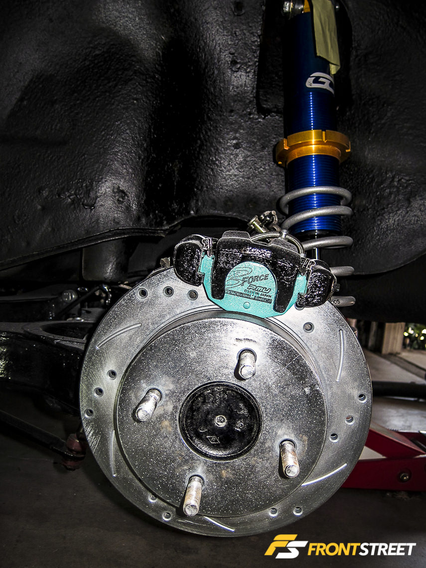 To increase braking performance, we purchased Stoptech slotted/drilled rotors, Project Mu B Force brake pads, and a set of Goodridge stainless steel brake lines. The drilled design of the rotors helps dissipate heat while the slotted grooves clean the pad, and are said to offer better bite and less brake fade in the process. The Project Mu B Force brake pads are designed to provide solid stopping power while emitting low dust and squeal properties.