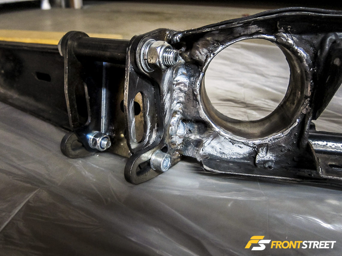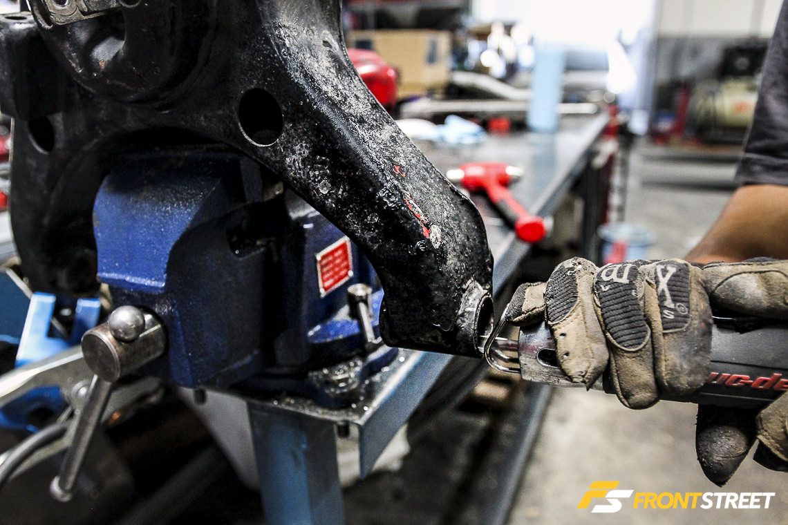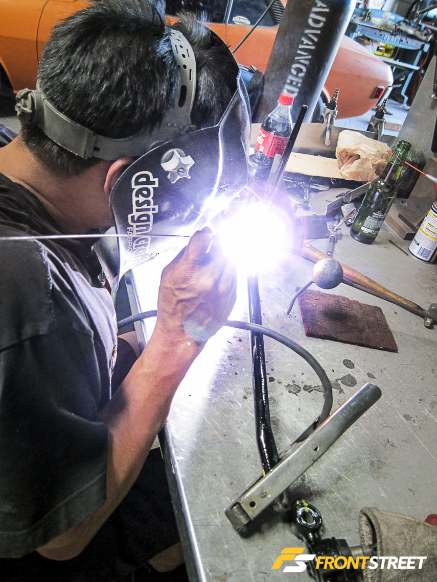 Futo Fab recommends using the OE rubber bushings or spherical bushings with their kit, as polyurethane with any camber/toe adjustments will cause the bushings to bind. We carefully cut out the OE collars holding the bushings and chiseled them out. The spherical bearings deliver increased NVH inside the vehicle, but offer significant handling improvements. We adjusted both arms to the cross member before Evasive Motorsports technician JJ TIG-welded the collars into place.