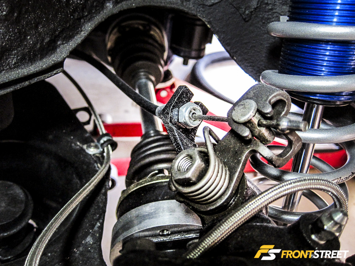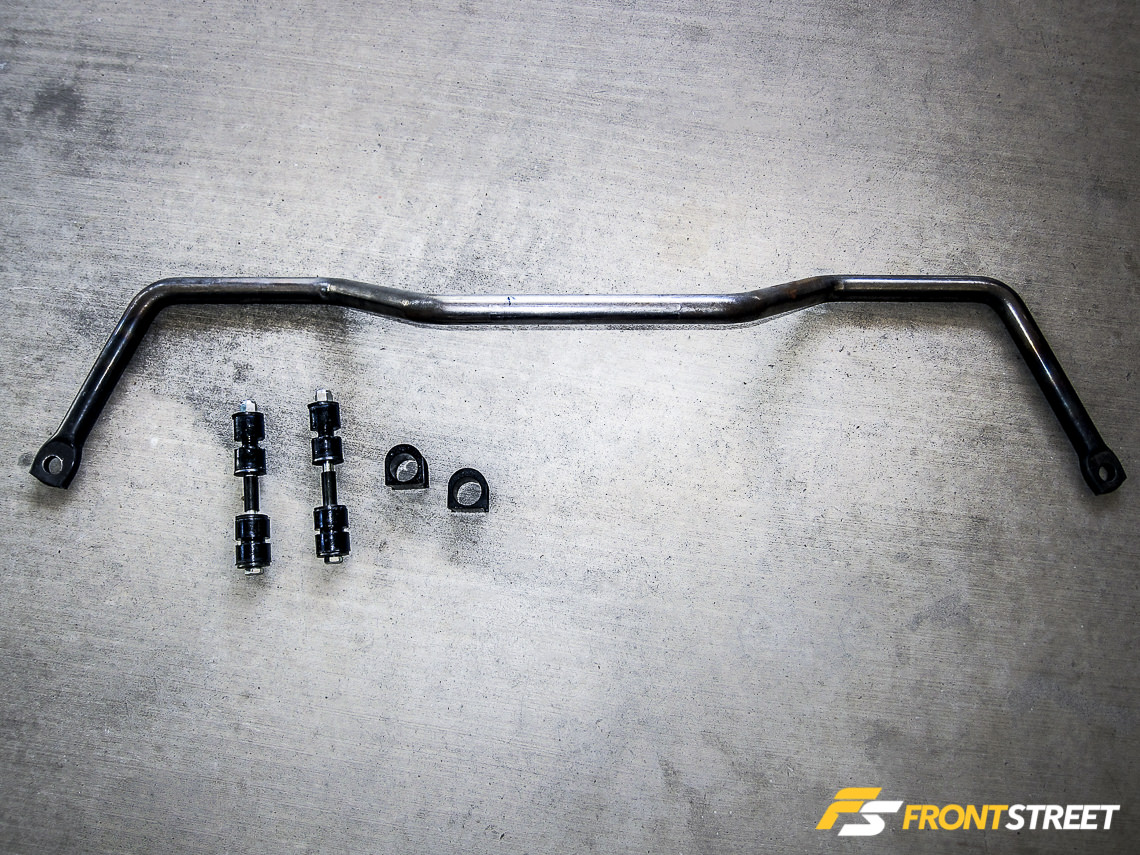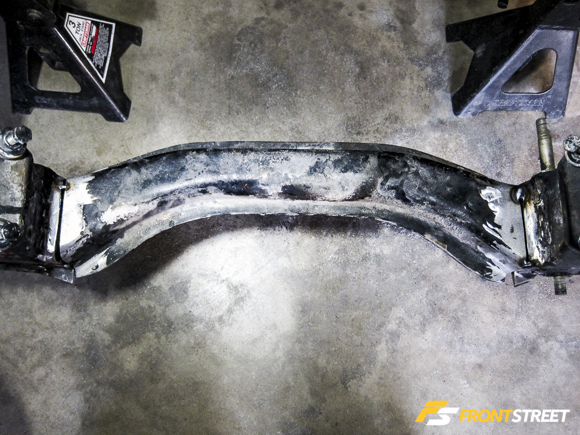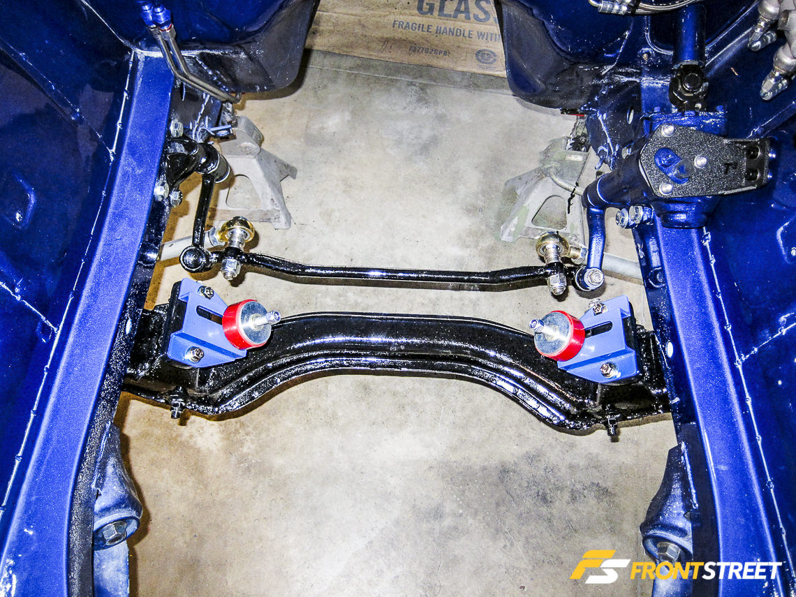 In order to properly clear our soon-to-be-installed SR20VE hybrid engine, we modified the factory cross member by cutting and flipping the unit to clear the oil pan. At the same time, we reversed the steering rod for transmission clearance and had Design Craft Fabrication weld the parts back together. A custom front sway bar designed specifically for the SR20 engine was also purchased and bolted into place.